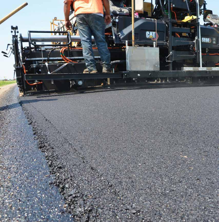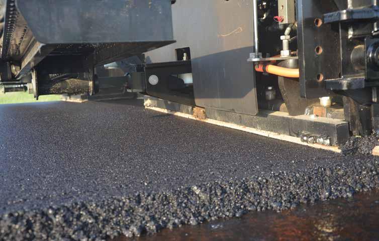 “Increased in-place density can enable compaction to occur on a hotter surface thereby shortening the compaction train,” Mansell says. “Higher stiffness values can lead to better longitudinal edge profiles and higher joint densities due to less lateral movement of the mix when being compacted. When the Cat SDX Screed Plate system is being used, we’re typically seeing anywhere from two to four per cent higher density behind the screed before the rollers. Getting that higher initial compaction while the ››