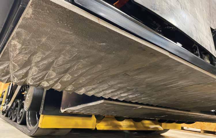 The angular plate design of the SDX screed kneads the surface of the mat. (Caterpillar)