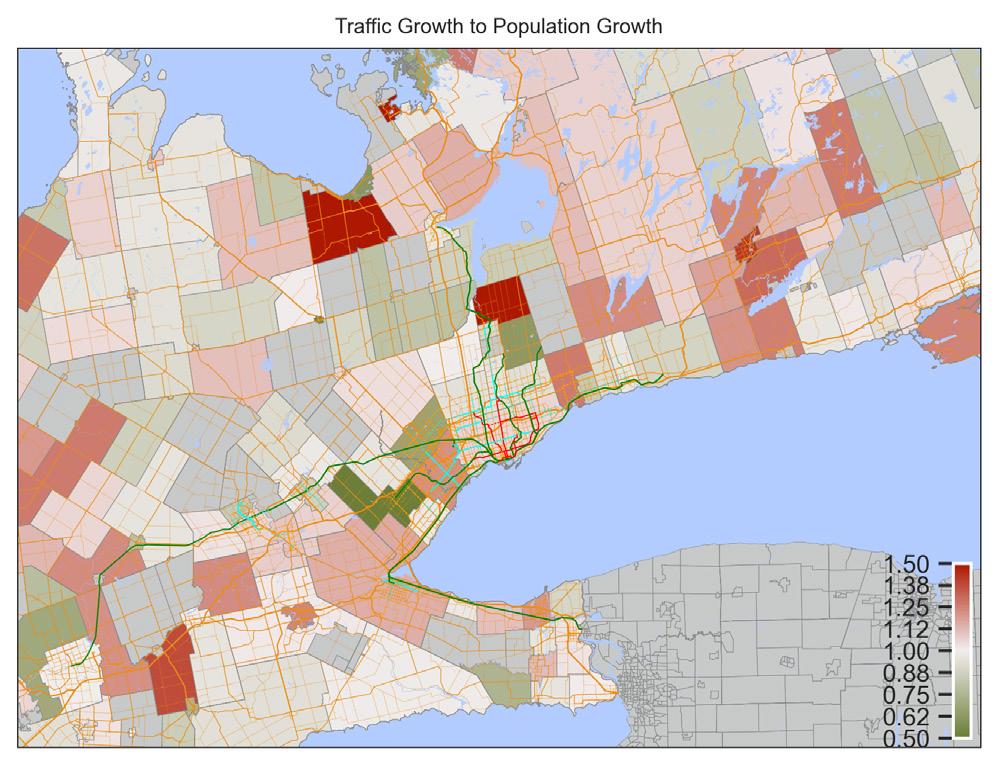 The growth of traffic relative to population highlights the changing dynamics within the region. As shown in Figure 7, traffic growth relative to population growth has varied across areas. Red regions indicate traffic growth outpacing population growth, while green regions show population growing faster than traffic. Key areas where traffic has grown more rapidly than population include the east of Lake Simcoe, as well as areas surrounding Peterborough and Hamilton. In these regions, more residents and businesses are moving in and commuting back toward Toronto, resulting in higher traffic-to-population growth ratio. Conversely, regions such as parts of York and the outskirts of the GTHA have more population growth than traffic growth. These regions have seen considerable new development, where not all residents are commuting as frequently.