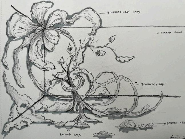 Terinspirasi dari bunga Wijaya Kusuma yang mekar dalam kesunyian malam, instalasi ini merefleksikan proses tumbuh yang tidak linear: berlipat, terpelintir, namun terus bergerak. Wijaya Kusuma mengajarkan bahwa keindahan sejati tidak harus disaksikan banyak mata. Begitu pula bunga ini, ia memilih mekar dalam keheningan, merangkul luka-lukanya sendiri, dan tetap hadir sebagai bentuk kehidupan yang berani, merdeka, dan apa adanya.