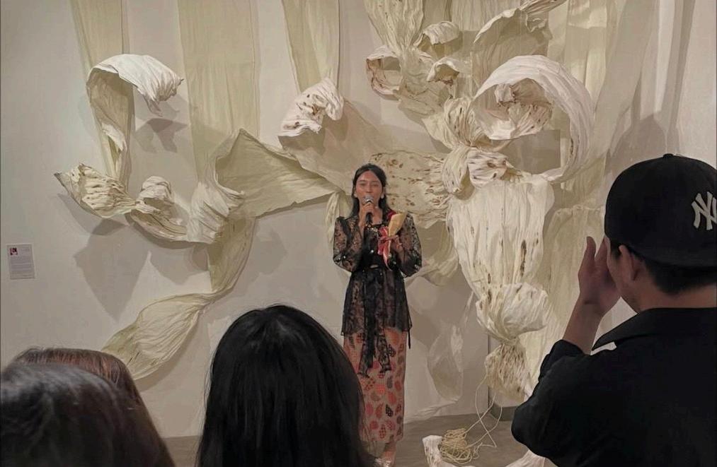 Elma Lucyana (Jakarta), dalam karya “Perlahan Menjadi Lain” terinspirasi dari bunga Wijaya Kusuma, yang mekar di malam hari, yang mengajarkan bahwa keindahan sejati tidak selalu harus disaksikan banyak mata Ia memilih mekar dalam senyap, rahasia, dengan luka-luka yang ia peluk sendiri, tapi tetap menjadi bunga yang hidup, berani, dan nyata. Melalui media kertas yang telah lama digelutinya Elma menawarkan ruang perenungan soal perjalanan dan eksistensi diri pada ruang waktu yang melambat, sunyi dan kemisterian proses tentang bagaimana sesuatu itu sebelum menjadi