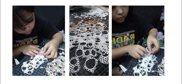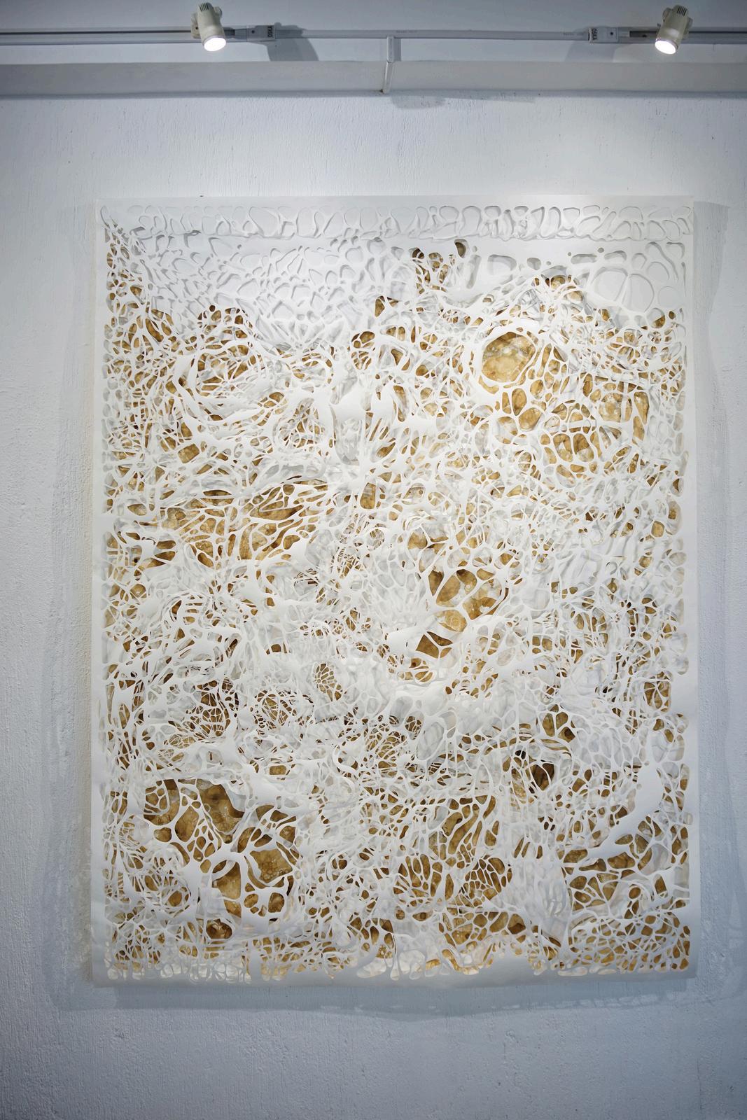 Risha Nabill (Bandung), baginya kertas bukan sekadar permukaan, melainkan ruang naratif tempat memori, emosi, dan struktur visual bertemu Sementara kopi digunakan bukan hanya sebagai material, tetapi sebagai simbol kehangatan, keterhubungan, dan keseharian, menjelma menjadi pigmen yang hidup melalui proses eksperimen dalam “Fragile Cartography in Paper”. Karya dengan teknik cutting papper ini disusun secara berlapis-lapis ini menggambarkan kerapuhan yang dipetakan, sekaligus memuat jalinan jejak memori yang berusaha mendamaikan luka yang bersilangan dan tak pernah utuh