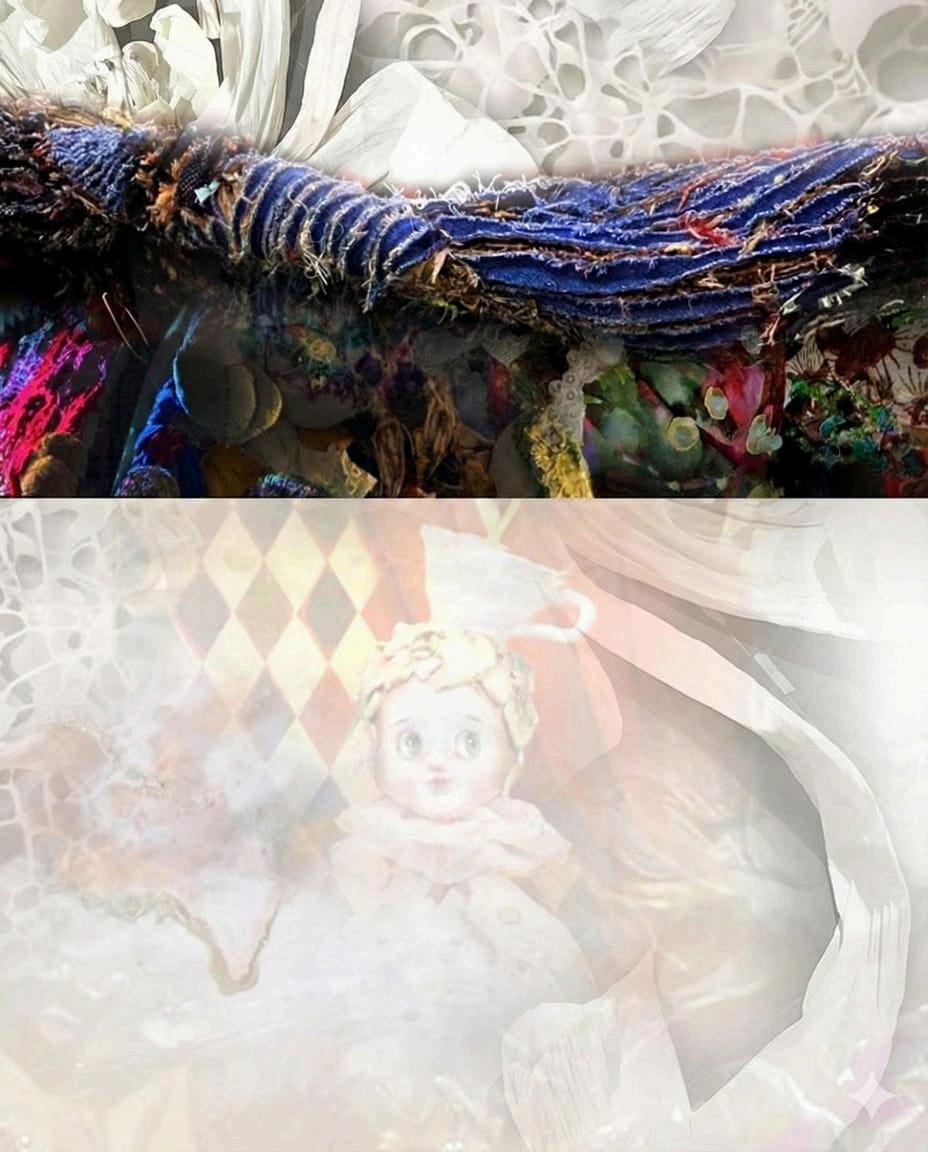 Dalam karya ini, saya menciptakan instalasi dari kumpulan kain perca yang tidak terpakai dengan teknik slashquilt, yaitu metode menumpuk kain, menjahitnya mengikuti pola tertentu, lalu menggunting bagian yang tidak dijahit. Potongan kain tersebut kemudian disikat hingga serat-seratnya keluar, membentuk tekstur berbulu atau berjuntai. Proses manipulasi ini merepresentasikan bagaimana sesuatu yang dijahit, disobek, dan terluka dapat melahirkan bentuk baru. Hamparan kain tersebut kemudian dibangun menjadi jas hujan yang dibentuk menyerupai tenda, berfungsi sebagai shelter tempat berlindung ketika keadaan tidak aman Di dalamnya terdapat tas serut sebagai simbol harapan, sementara bagian lantainya menghadirkan lanskap hijau dan duri yang mencerminkan dinamika perjalanan batin pasca periode manik.
