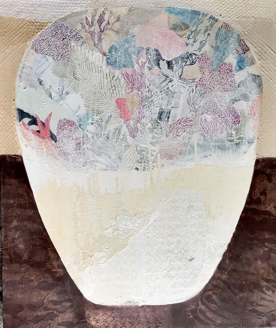 Penggunaan objek dan citra Bejana terakota bagi Davina seperti mengungkap sejarah yang panjang dan kaya di Asia Tenggara, sejak ribuan tahun yang lalu. Bejana mengungkap pengetahuan menarik mengenai budaya, kepercayaan, dan kehidupan sehari-hari komunitas kuno di wilayah tersebut. Dalam studi arkeologi dan sejarah, istilah bejana biasanya mengacu pada wadah atau benda berongga yang dirancang untuk menampung, menyimpan, atau mengangkut cairan, biji-bijian, atau bahan lainnya. Bejana dapat dibuat dari berbagai bahan, seperti tanah liat (terakota), logam, kaca, atau batu, dan dapat digunakan untuk keperluan praktis, seremonial, atau simbolis. Serial karya monoprint dengan citra bejana menggunakan palet warna biru tua dan hijau untuk menciptakan bentuk abstrak dan organik yang menyerupai vas/bejana atau bentuk karang, dengan latar belakang putih bertekstur, dengan pola rumit dan berlapis dalam setiap bentuk membangkitkan pemandangan bawah air, mungkin mengacu pada kehidupan laut, struktur karang, hewan kerbau, ornamen tradisional dan lainnya.