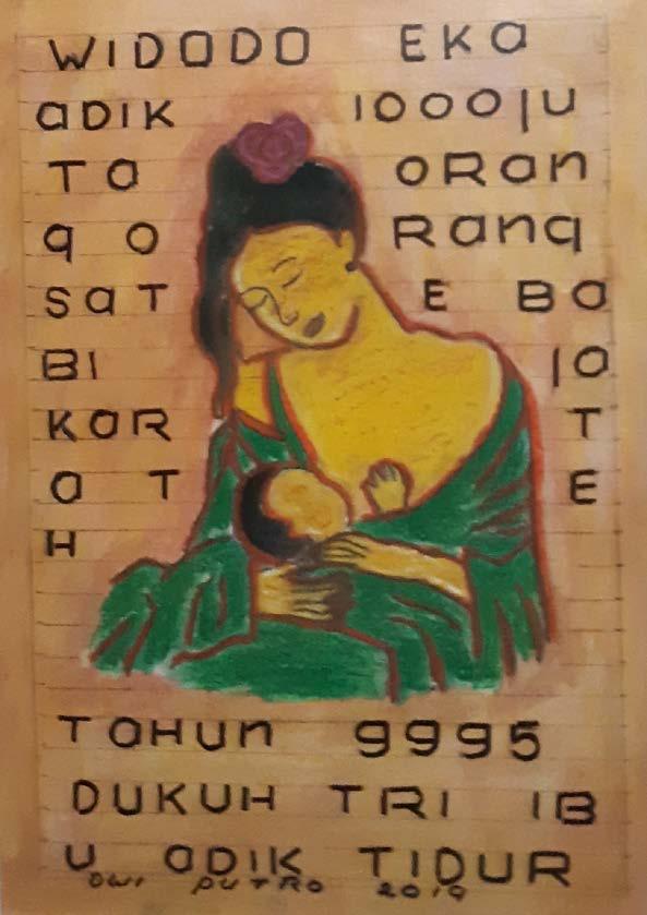 Pak Wi merupakan sosok “seniman” yang tak lazim. Ia masih menampakkan gejala skizofrenia residual yang masih menampak pada tulisannya yang melompat-lompat dan terbelah. Hidupnya bergantung kepada sang adik, yang sadar dan tahu betul bagaimana sang kakak berperilaku. Saya menawarkan Pak Wi dan Nawa berpameran di Orbital Dago. Mereka berdua pun punya nama DWI-TUNGGAL ; berdua tapi sekaligus satu kesatuan.
