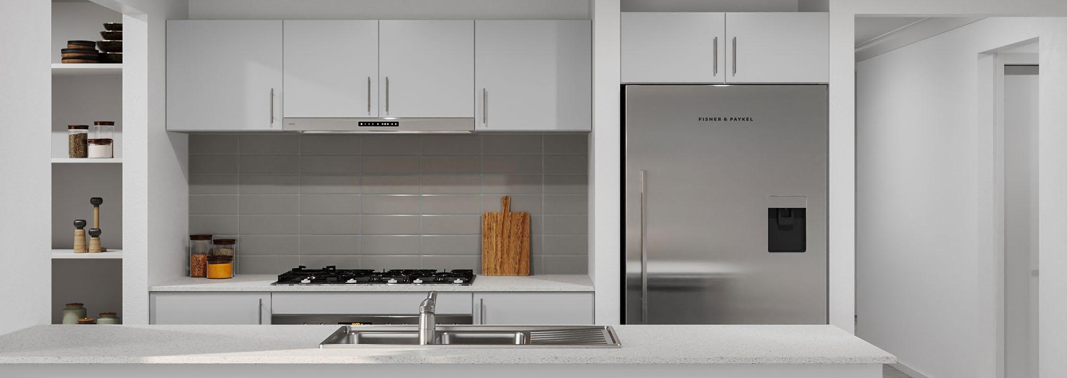 Overhead Cabinet: Orbit Homes Group 1 range 550mm high laminated modular cabinets to full length of cooktop wall and 305mm high to fridge space