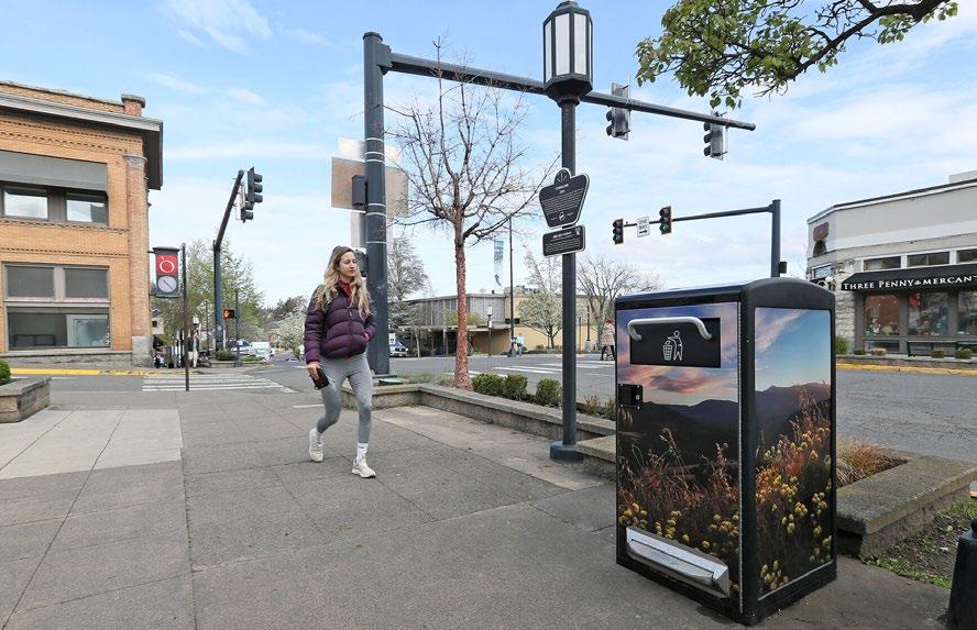 Downtown Ashland’s new curbside trash cans feature eye-catch ing designs, trash compactors inside and are powered by solar panels. Eleven of the heavy-duty, cubic containers have been placed at downtown locations with a history of overflowing trash and high foot traffic.