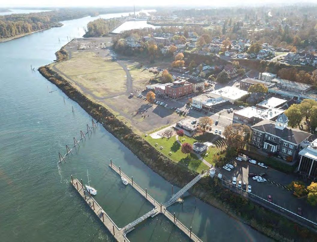 This sky-high view shows the planned area of the St. Helens Riverwalk along the Columbia River. Courtesy of the City of St. Helens