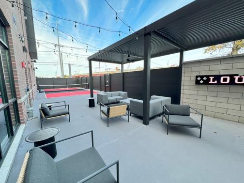 Enclose space with curtain wall for acoustic separation from gaming space. Opening is approx 37' wide.