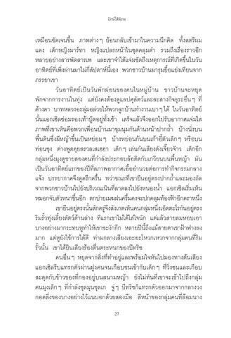 เหมือนชัดเจนขึ้น ภาพต่างๆ ย้อนกลับเข้ามาในความนึกคิด ทั้งสตรีผม แดง เด็กหญิงมาร์ทา หญิงแปลกหน้าในชุดคลุมด�ำ รวมถึงเรื่องราวอีก หลายอย่างสารพัดสารเพ และเขาจ�ำได้แจ่มชัดถึงเหตุการณ์ที่เกิดขึ้นในวัน อาทิตย์ทเี่ พิง่ ผ่านมาไม่กสี่ ปั ดาห์นเี้ อง พวกชาวบ้านมารุมยือ้ แย่งเทียนจาก ภรรยาเขา วันอาทิตย์เป็นวันพักผ่อนของคนในหมู่บ้าน ชาวบ้านจะหยุด พักจากการงานในทุ่ง แต่ยังคงต้องดูแลปศุสัตว์และสะสางกิจธุระอื่นๆ ที่ ค้างคา บาทหลวงอะลุม่ อล่วยให้พวกลูกบ้านท�ำงานเบาๆ ได้ ในวันอาทิตย์ นั้นแอกเซิลซ่อมรองเท้าบู๊ตอยู่ทั้งเช้า เสร็จแล้วจึงออกไปรับอากาศแจ่มใส ภาพที่เขาเห็นคือพวกเพื่อนบ้านมาชุมนุมกันด้านหน้าปากถ�้ำ บ้างนั่งบน พื้นดินซึ่งมีหญ้าขึ้นเป็นหย่อมๆ บ้างหย่อนก้นบนเก้าอี้ตัวเล็กๆ หรือบน ท่อนซุง ต่างพูดคุยสรวลเสเฮฮา เด็กๆ เล่นกันเสียงดังเจี๊ยวจ๊าว เด็กอีก กลุ่มหนึ่งมุงดูชายสองคนที่ก�ำลังประกอบล้อติดกับเกวียนบนพื้นหญ้า มัน เป็นวันอาทิตย์แรกของปีทสี่ ภาพอากาศเอือ้ อ�ำนวยต่อการท�ำกิจกรรมกลาง แจ้ง บรรยากาศจึงดูครึกครื้น ทว่าขณะที่เขายืนอยู่ตรงปากถ�้ำและมองถัด จากพวกชาวบ้านไปยังบริเวณเนินที่ลาดลงไปยังหนองน�้ำ แอกเซิลเริ่มเห็น หมอกจับตัวหนาขึน้ อีก ตกบ่ายเมฆฝนครึม้ คงจะปกคลุมท้องฟ้าอีกคราหนึง่ เขายืนอยูต่ รงนัน้ สักครูจ่ งึ สังเกตเห็นคนกลุม่ หนึง่ เอ็ดตะโรกันอยูต่ รง ริมรั้วทุ่งเลี้ยงสัตว์ด้านล่าง ทีแรกเขาไม่ได้ใส่ใจนัก แต่แล้วสายลมหอบเอา บางอย่างมากระทบหูทำ� ให้เขาชะงักกึก หลายปีนถี้ งึ แม้สายตาเขาฝ้าฟางลง มาก แต่หูยังใช้การได้ดี ท่ามกลางเสียงเอะอะโหวกเหวกจากกลุ่มคนที่ริม รั้วนั้น เขาได้ยินเสียงร้องตื่นตระหนกของบีทริซ คนอื่นๆ หยุดจากสิ่งที่ท�ำอยู่และพร้อมใจหันไปมองทางต้นเสียง แอกเซิลรีบแทรกตัวผ่านฝูงคนจนเกือบชนเข้ากับเด็กๆ ที่วิ่งซนและเกือบ สะดุดกับข้าวของที่กองอยู่บนสนามหญ้า ยังไม่ทันที่เขาจะเข้าไปถึงกลุ่ม คนมุงเล็กๆ ที่ก�ำลังชุลมุนชุลเก จู่ๆ บีทริซก็แทรกตัวออกมาจากกลางวง กอดสิ่งของบางอย่างไว้แนบอกด้วยสองมือ สีหน้าของกลุ่มคนที่ล้อมนาง 27