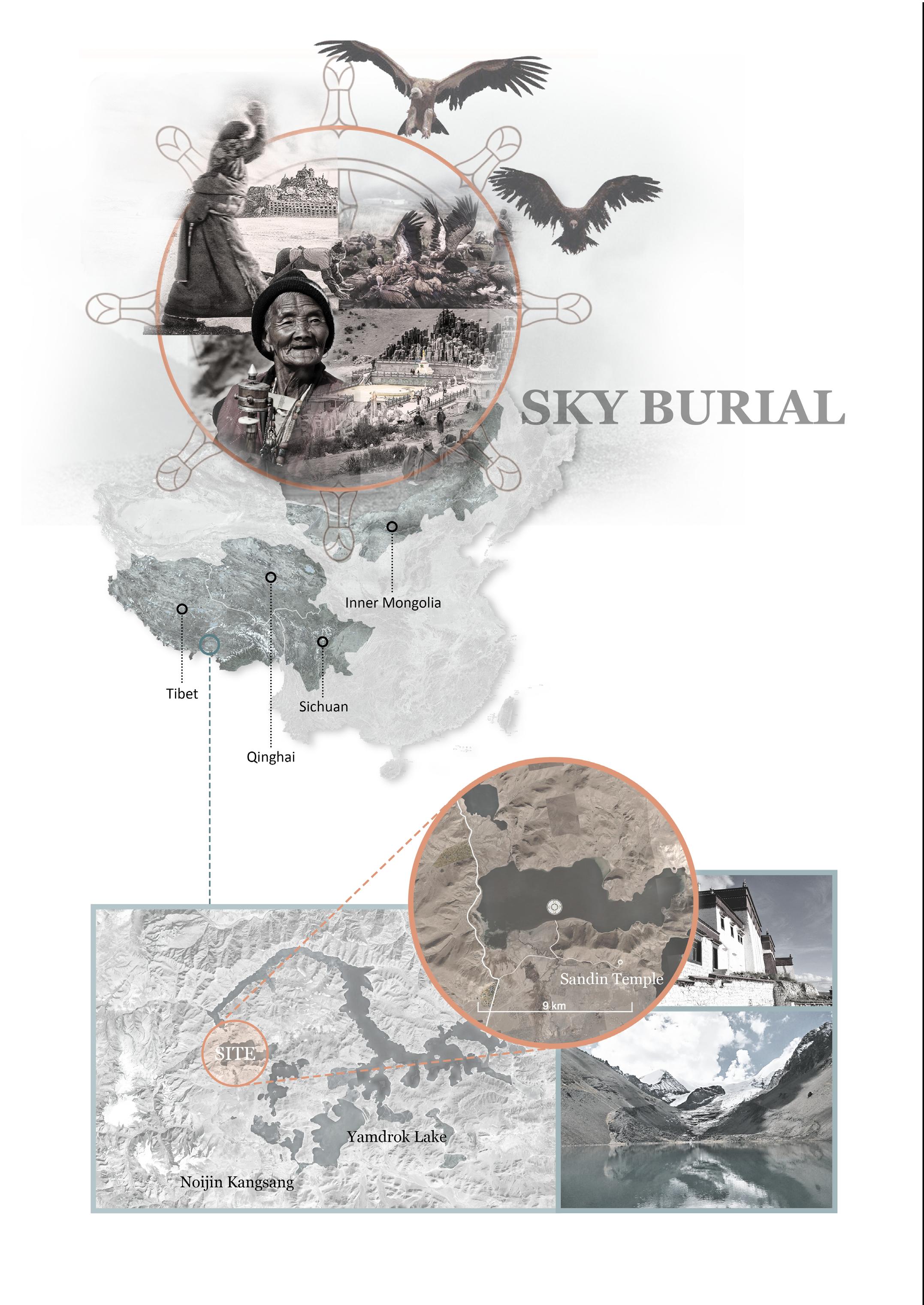Sky burial in Tibet is a funeral practice in which a human corpse is placed on a mountaintop to decompose while exposed to be eaten by vulture. This project focus on exploring a design possbility of sky burial platform with religious and public space around it. The whole complex combines post-modernism and the spiritual core of Buddhism. I hope this project can not only provide a proper space for the rite, but also helping the public to understand sky burial.