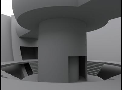 After people visit the factory, they will come in to the top of the core and visit several exhibition hall which are connected by a rotary ramp. A big stage is located at the bottom.