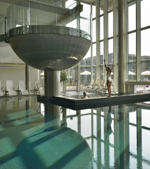 no tenui e qua e là spicca un tocco di verde così da rendere l’ambiente tutt’uno con la rigogliosa corte interna. Un ampio ed elegante living conduce nella camera con l’originale letto rotondo e vasca Jacuzzi, un’ oasi di relax. Non si può raccontare la proposta di Aqualux senza descrivere l’AquaExperience, una realtà impareggiabile con otto piscine termali, interne ed esterne, percorsi di acqua corrente, una vasta vasca salina, piacevolissimi idromassaggi e aero- massaggi. L’acqua è la protagonista incontrastata di tutta la struttura, che coccola gli ospiti circondandoli di una calma rilassante. Tutti gli ospiti possono godere dei numerosi benefici dell’acqua termale della fonte “San Severo” che scaturisce da una profondità di oltre 300 metri, ricca di calcio, magnesio e bicarbonati: un vero toccasana non solo per la pelle ma per tutto l’organismo, che