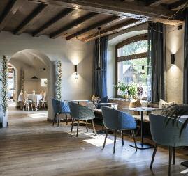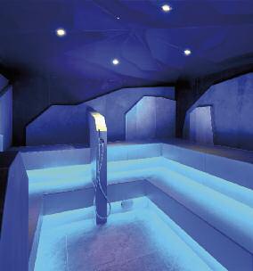 vallata dell’Inn si ha accesso alla zona lounge, dove prendere un cocktail la sera, e al ristorante, uno dei punti forti della struttura L’Atelier Freund-Schafft è un piccolo ristorante pluripremiato (3 forchette Falstaff e 3 cappelli Gault Millau), dove lo chef, Markus Freund, propone un menù a sorpresa di 6 portate, ma solo per pochi ospiti e su prenotazione Ma il vero fiore all’occhiello del Royal Panorama rimane la sua SPA che è stata recentemente riammodernata Nell’area umida si trovano sette tra piscine riscaldate, vasche saline e vasche fredde, quest’ultime da utilizzare dopo una sessione di sauna o ancor meglio di aufguss che, com’è noto, è una pratica molto in voga nel Tirolo e nell’hotel viene eseguita per 2/3 volte al giorno. L’intera zona, dedicata al benessere del corpo e della mente, è situata al livello meno 1 e meno 2. Definirlo il regno delle saune appare riduttivo per l’alto numero di proposte a temperature differenti, così come sono altrettanto molte le zone relax con lettini dove, nel totale silenzio e sorseggiando una tisana, è possibile ammi-