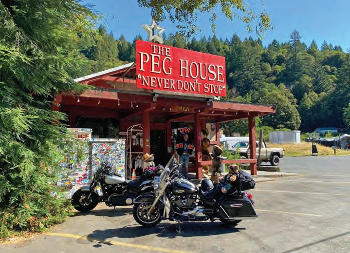 The delicatessen features fantastic sandwiches (turkey roasted there) and other delights. The Grill is outside, in back, where you can sit in a garden. The grill features Tri-Tip sandwiches, Humboldt Grass-Fed Beef burgers and fresh, sweet Arcata Bay oysters. A beautiful redwood stage creates a venue for summer music, movies, and other events. Diana’s award-winning jams, jellies, salad dressings, candies, brownies and cookies make a simple co ee break an event. Try the “Mendo Mookie” — a cross between an oatmeal mu n and a cookie. The Peg House has some of the coolest gifts on the road. More collector items than tourist fodder, it features unique postcards, books, signs, locally-made designer jewelry and other classy gifts and gear. Open from 7AM ’til sunset, hours varying with the seasons. Remember, “Never Don’t Stop” at The Peg House.