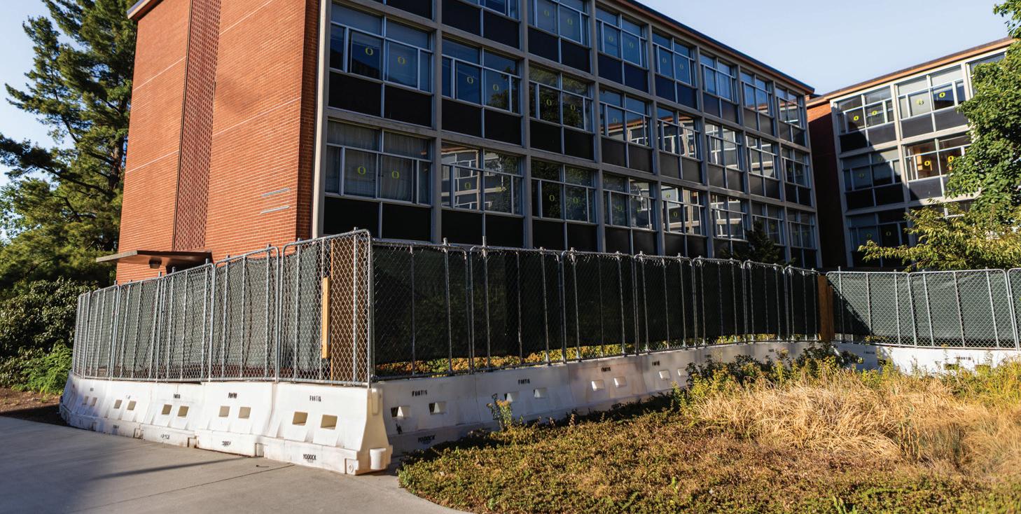 Barriers, fences and construction trailers currently surround and block off Friendly Hall.