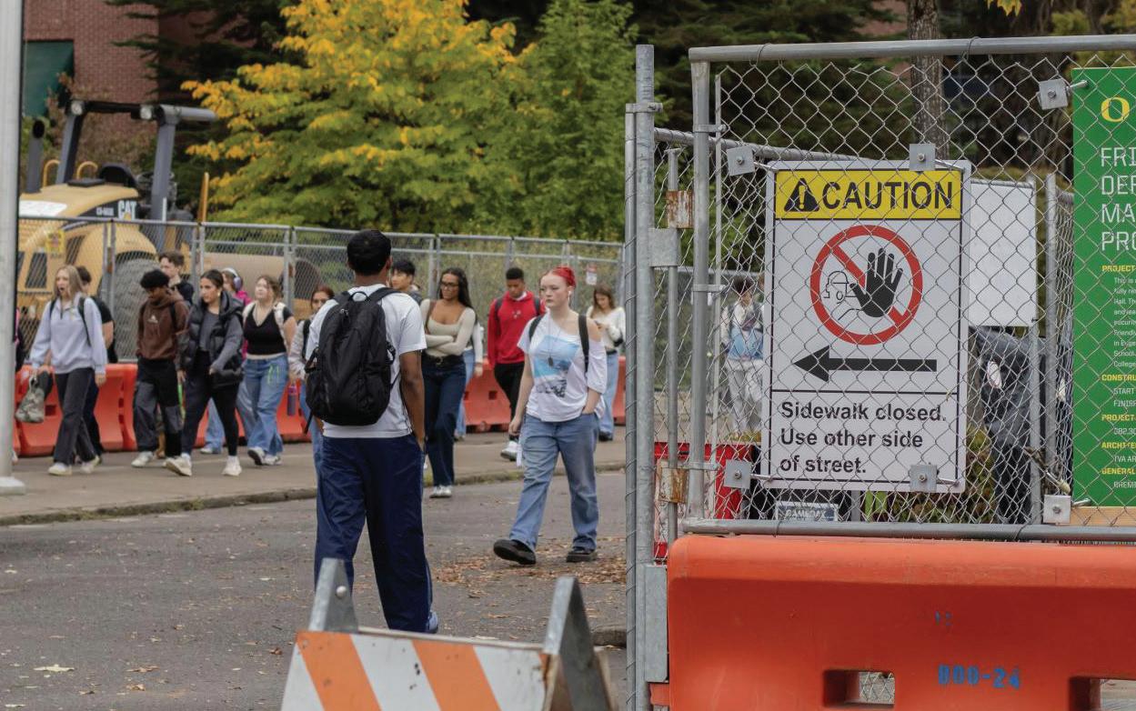 (ON THE COVER) Students pass through East 13th Ave. and avoid the construction site beside Friendly Hall on the University of Oregon campus. Eugene, Ore. on Oct. 2, 2025.