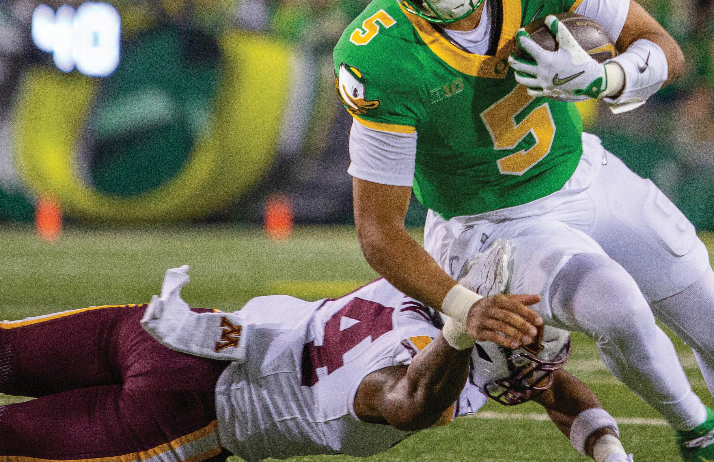 (BELOW) Oregon quarterback Dante Moore (5) dodges a Minnesota defender. The University of Oregon hosted the University of Minnesota Golden Gophers in a Friday night matchup at Autzen Stadium in Eugene, Ore., on Nov. 14, 2025. (Corey Hoffman/Emerald)