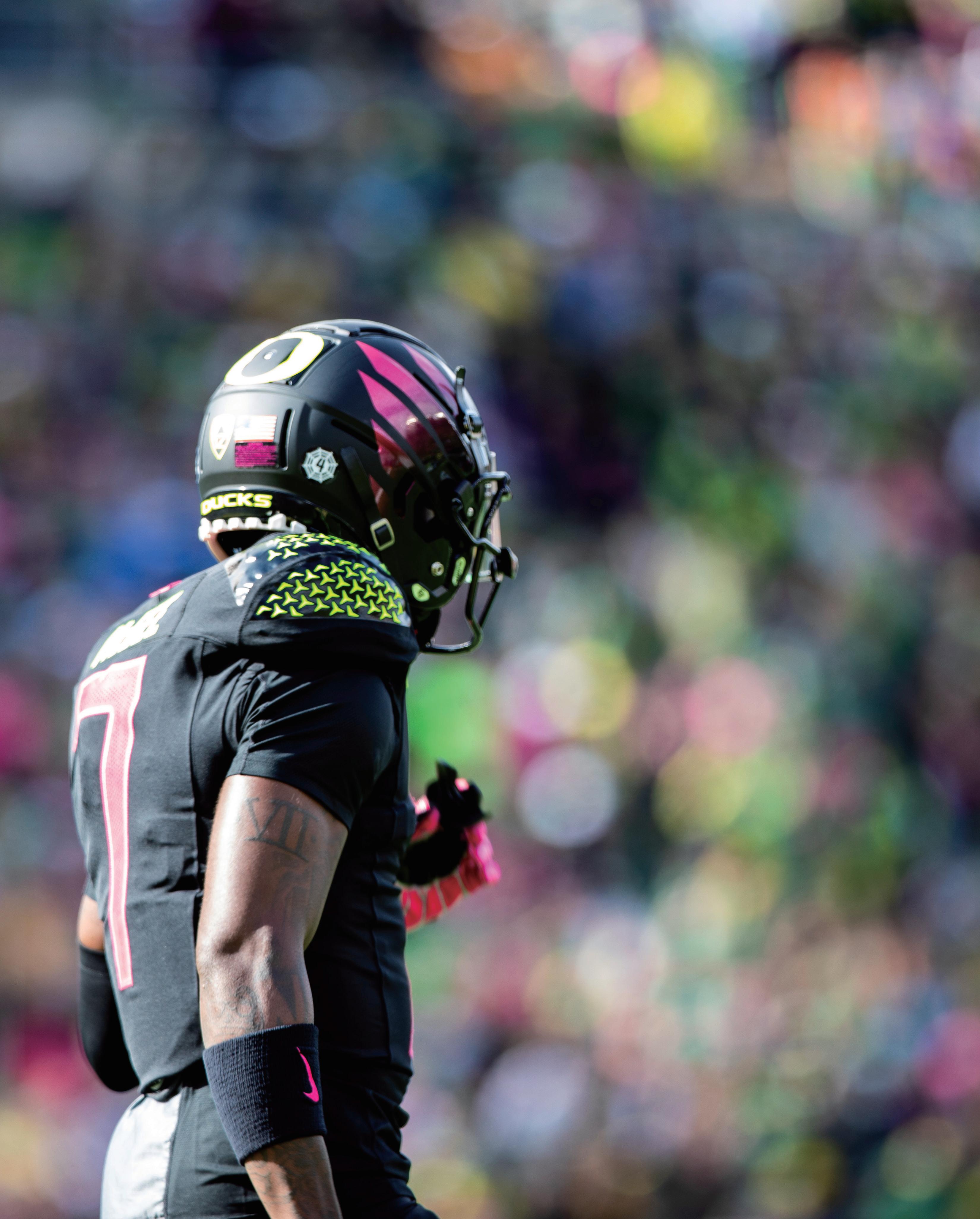 Ducks wide recever Seven McGee pauses for a moment during the pre-game warm up. Oregon Ducks take on the UCLA Bruins at Autzen Stadium in Eugene, Ore., on Oct. 22, 2022. (Ali Watson/Emerald)