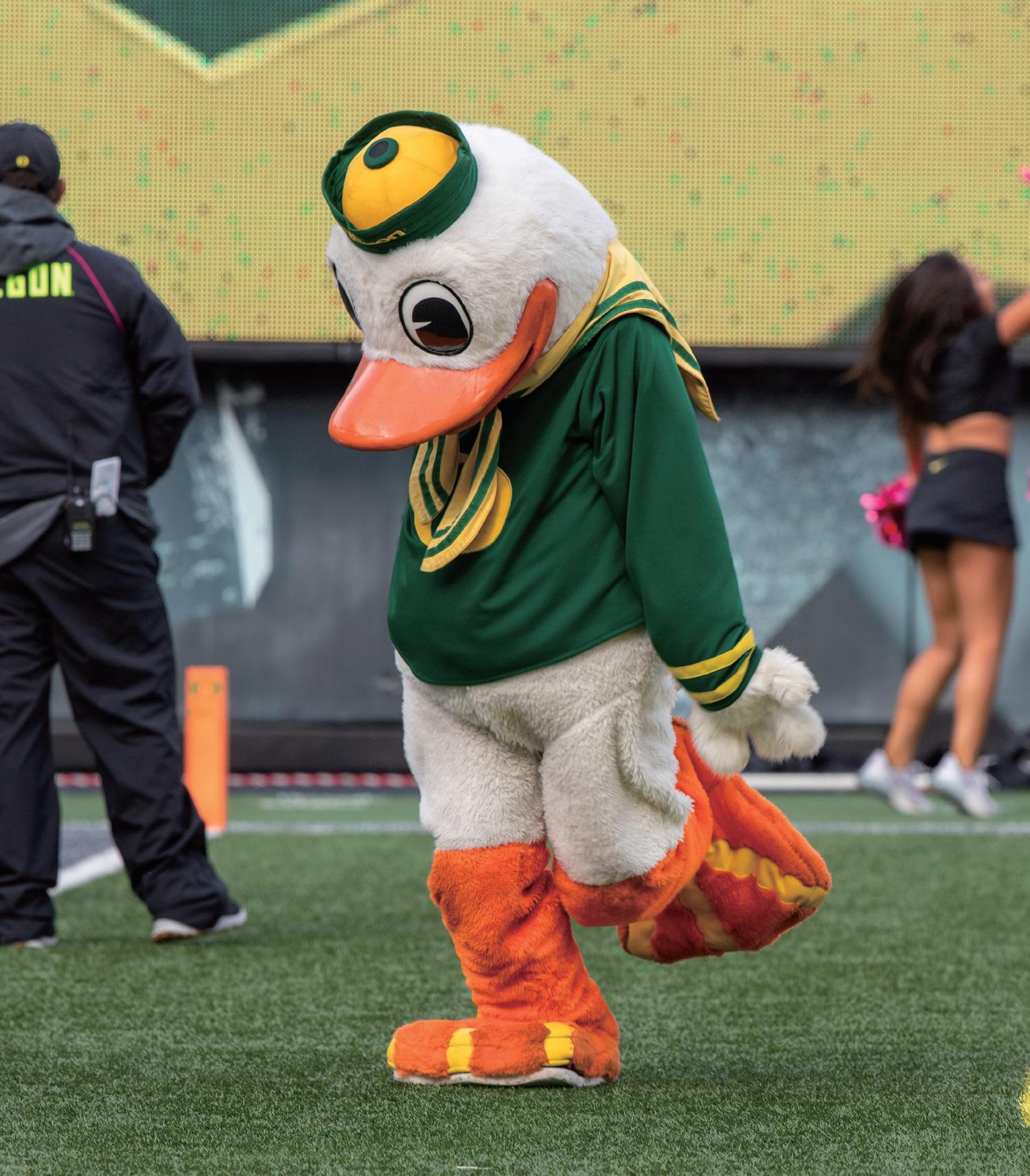 Duck joins Oregon cheerleaders as they sing and dance to Oregon’s third quarter tradition, “shout.” The University of Oregon Ducks hosted and defeated the Oregon State Beavers 38-29, claiming the Pac-12 North champions title. (Emerald/ Ian Enger)
