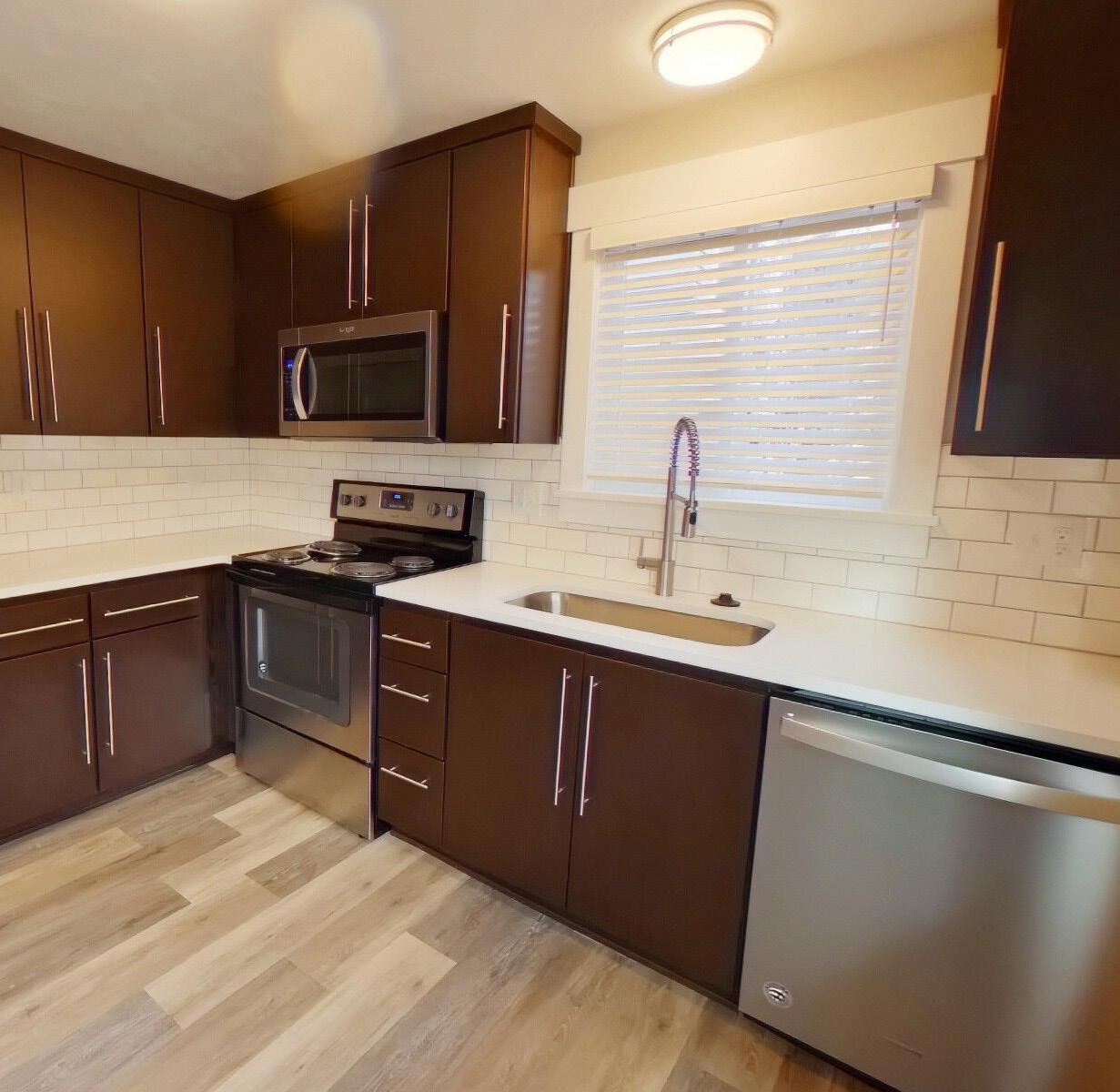 Remodeled kitchen features new dark cabinets with stainless steel appliances, including dishwasher, microwave and garbage disposal.