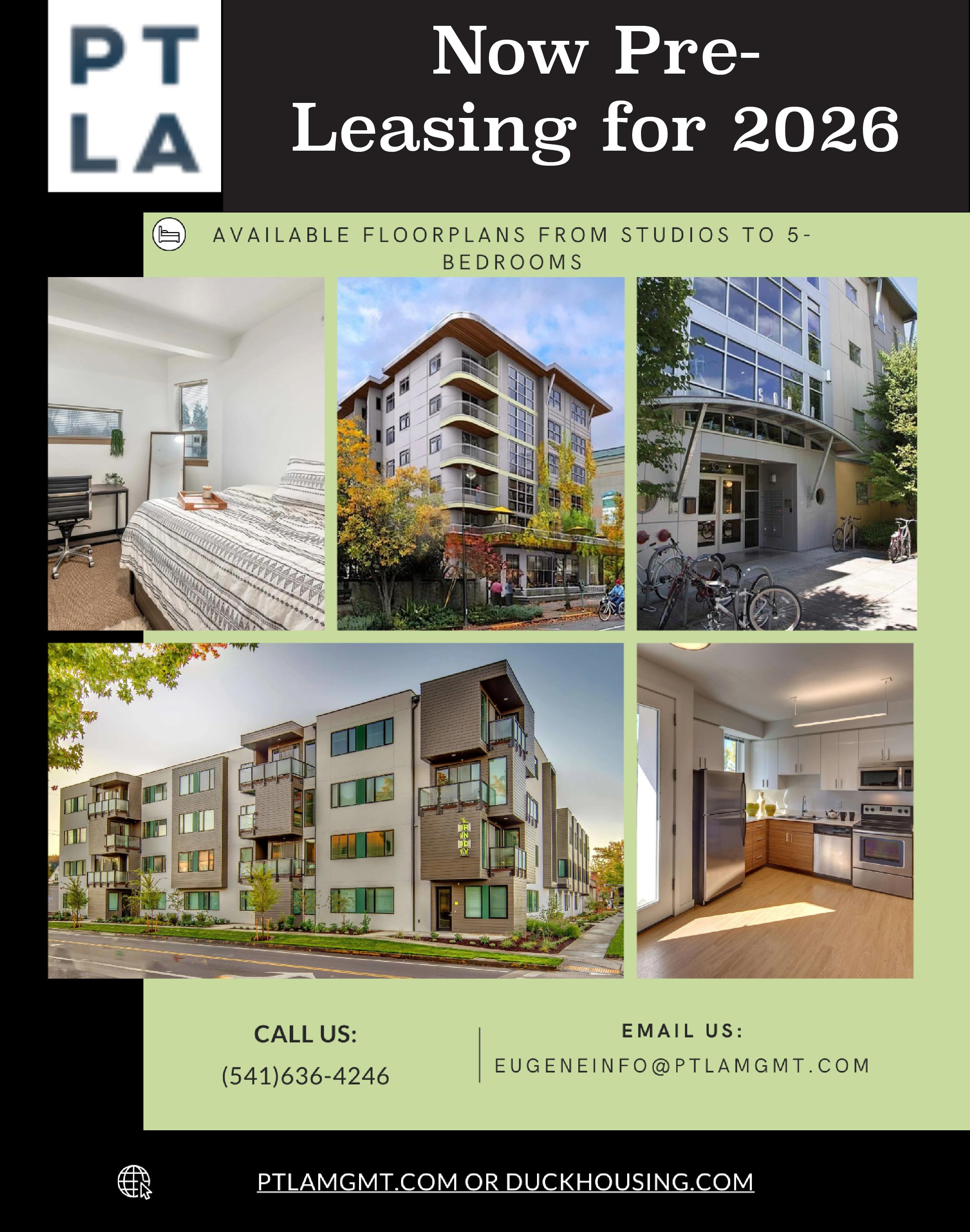 The Housing Comparison Guide is filled with easy-to-find information for University of Oregon students who are searching for a place to live. The guide compares a variety of properties surrounding the UO campus. For students looking for housing - this guide is for you!