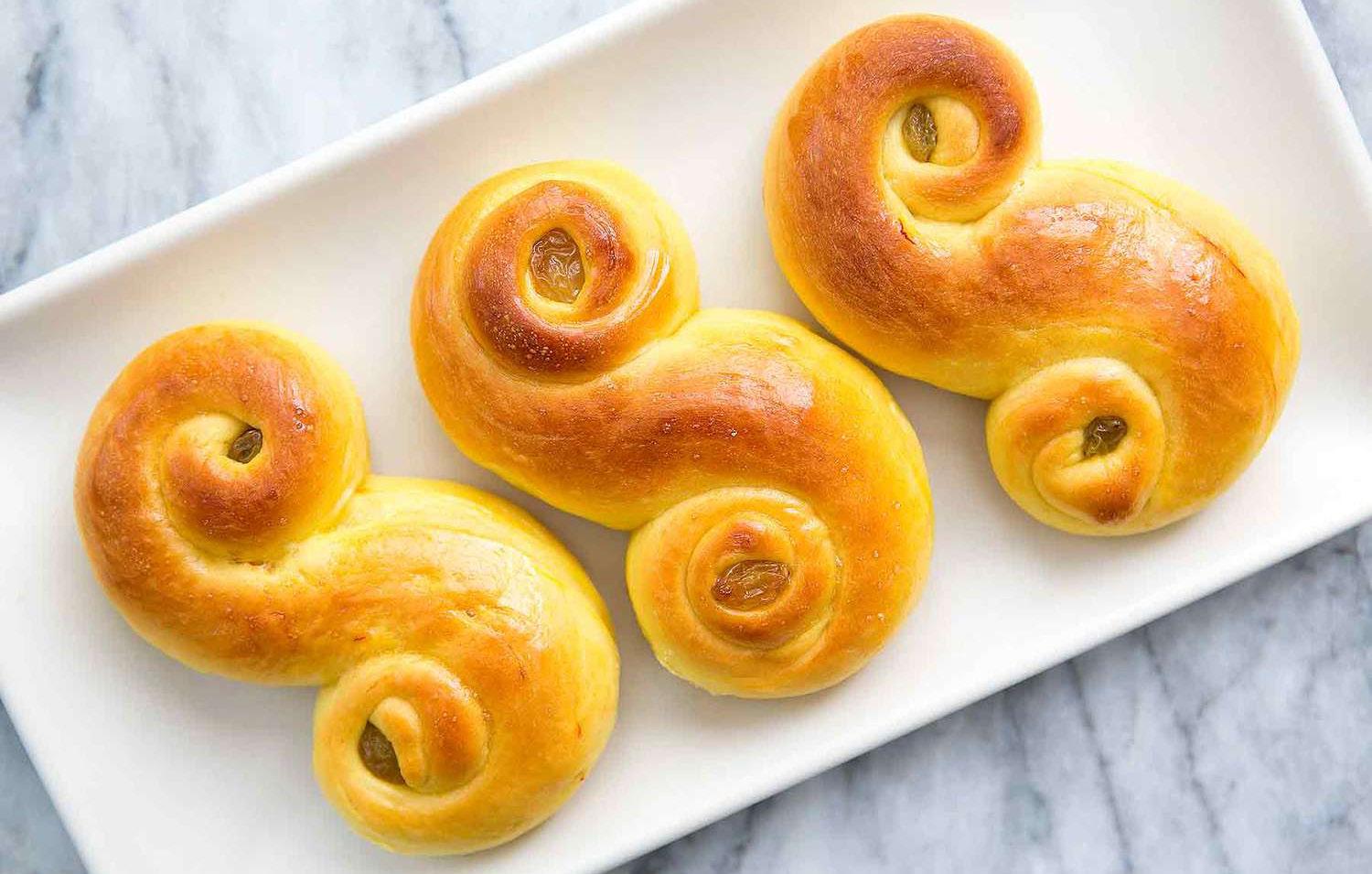 Pour milk over the dry ingredients, add two eggs plus the extra yolk. Mix well and knead until smoothe. Allow to rise one hour, deflate and cut into twelve pieces. Form dough into S shapes and let rise another 30 minutes.