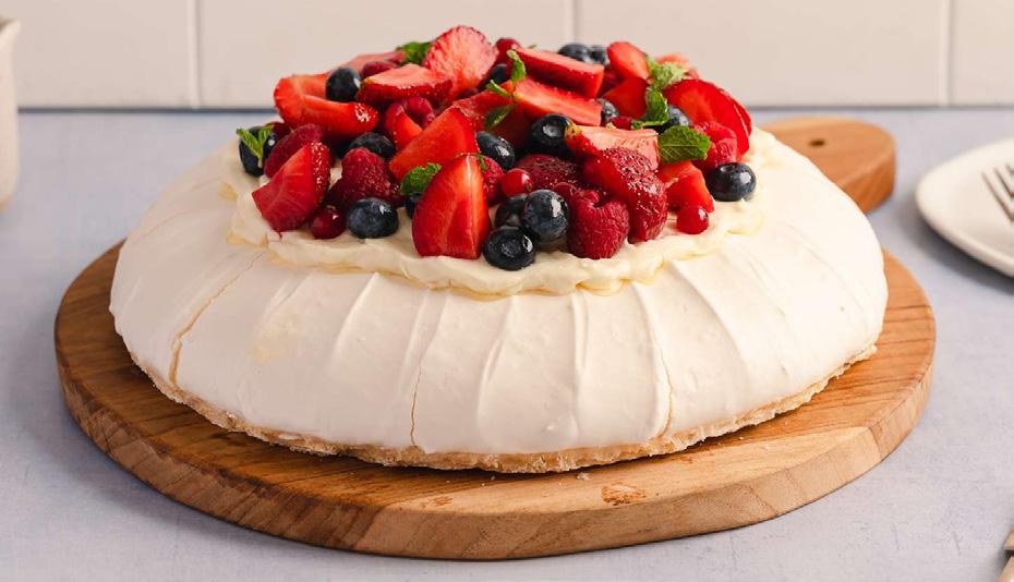 In NEW ZEALAND Christmas also falls in the hot summer months. Families are often celebrating their summer holidays by camping or staying at the beach. There are parades and Christmas trees. The Christmas meal is barbecued meats or seafood. Desserts such as hot fruit pudding or meringues are served. Pavlova is a favorite dessert. Presents are opened on Christmas day before the special lunch.