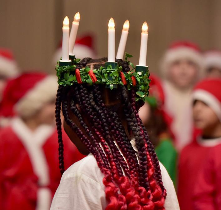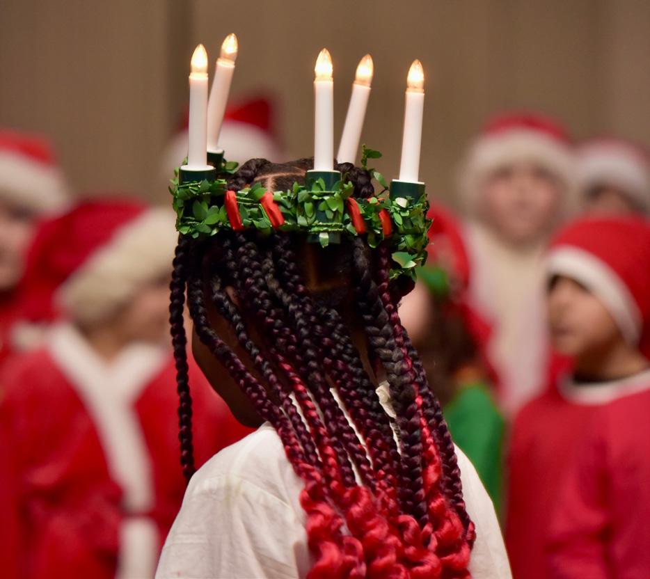 In SWEDEN St. Lucia’s day is celebrated on December 13th. St. Lucia was a Christian martyr from 304 AD known for secretly taking food to persecuted Christians in the catacombs of Rome. Today young girls dress in white dresses with a red sash, and wear a crown of lights to help Lucia find her way. Special Lucia Day buns called Lussekatts are served. Then on Christmas Eve a huge buffet known as julbord is eaten in courses. It begins with cold fish dishes and moves to cold meats, warm meat dishes and desserts. Glogg, a sweet, mulled wine, and coffee are favorite drinks. Homes are decorated with straw to remind everyone that Jesus was born in a manger. Gifts are brought by small gnomes called jultomten.