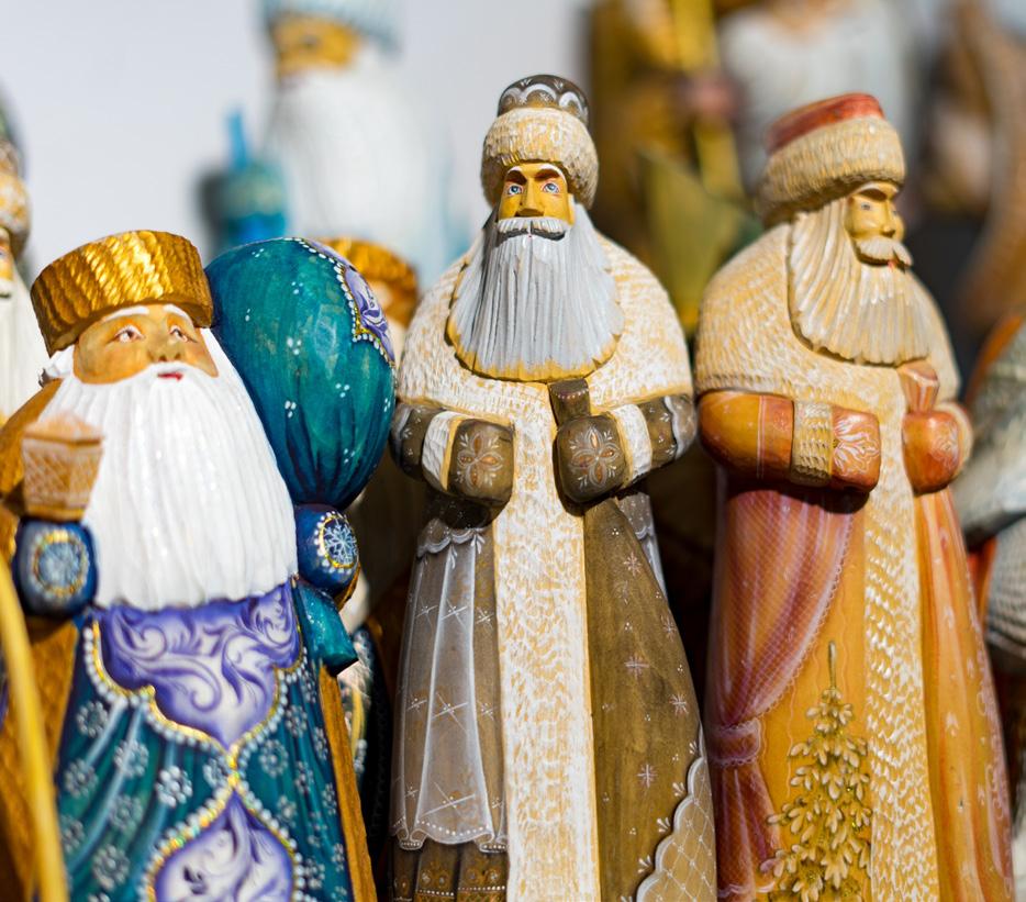 In RUSSIA Christmas is celebrated by the Orthodox Church. Once banned by the communist regime, Christmas is again celebrated with special church services, and wonderful meat and cabbage pies called pirogi and meat dumplings known as pelmeni. A porridge, kutya, is served along with honey and poppy seeds to bring happiness, success and peace. Children carry a star and go house to house in the cold winter snows singing carols and receiving sweets.