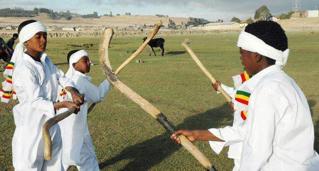 called a Shamma. It is a thin white cotton toga-like outfit. The Shamma is worn to a special service held in the circle-shaped church. Candles are held in a procession and communion is taken. At the time of Ganna men and boys play a game similar to hockey also known as ganna. Special foods eaten at this time of year are meat and vegetables called wat and flatbread, known as injera. Children usually receive gifts of clothing.