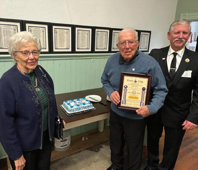 On January 20, 2026, at Rainier Lodge No. 24, W.B. Mark R. Reed, Senior Grand Deacon, was thrilled and honored to present to 95-year young W.B. Lawrence “Buzz” F. Beck his 70-year jewel and certificate. Buzz was a small business owner in Rainier, Ore. and very active in his community. He became a Master Mason on November 29, 1955 and was Worshipful Master in 1961. The Brothers of Rainier Lodge and his supportive wife Alice were in attendance for the presentation. Cake and fellowship were enjoyed by all.