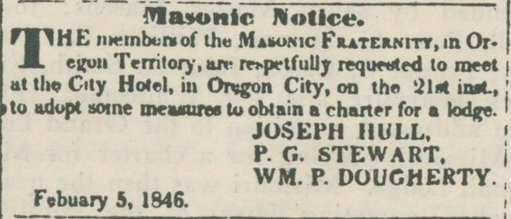 The fi rst newspaper published on the Pacific Coast was printed in Oregon City under the name of “The Spectator”. In the very fi rst issue, February 5, 1846, was printed a call for all Master Masons to meet on February 21, 1846, to adopt some measures to obtain a charter for a Lodge.