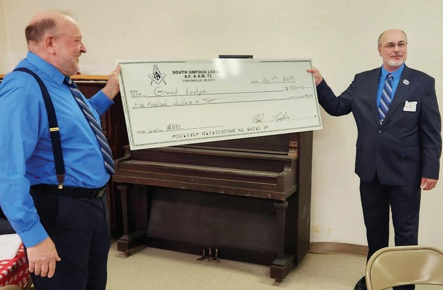 During the Grand Master’s Official Visit to South Umpqua Lodge on May 4, R.W.B. Dave Sherman (left) presented M.W.B. Mark Posler (right) with a $500 check for the Grand Master’s charity, Mt. Hood