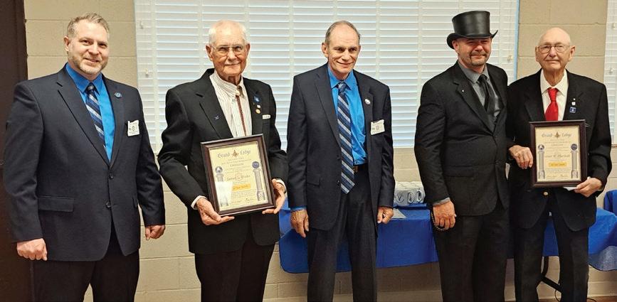 Medford Lodge presented 50 and 60year Service Awards at their Stated Meeting dinner. Pictured L to R: W.B. John Lohrfink, Junior Grand Deacon; W.B. James Hinks, 50-year award; R.W.B. Billy Thompson, District Deputy No. 17; Worshipful Master Adam Caffey; and W.B. Lester Wayne Marshall, 60-year award.