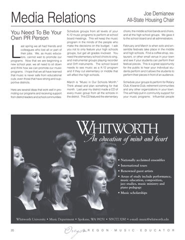 We hope that you like the new look of the oregon music educator and the website www.oregonmusic.org. We are working with two wonderful web designers, marie and art Wirtz in Bend at the ‘thegarageinc” on the website. it has been a real push to