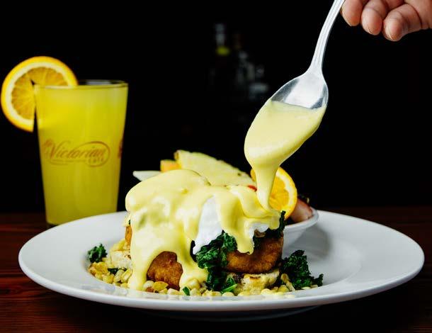Carnitas topped with two poached eggs, cotija cheese, avocado, cilantro, and house made chipotle Hollandaise sauce atop an English muffin.