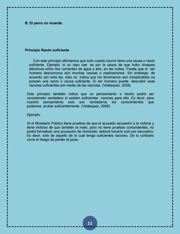 Principio Razón suficiente Con este principio afirmamos que todo cuanto ocurre tiene una causa o razón suficiente. Ejemplo: si un rayo cae es por la causa de que hubo choques eléctricos entre dos corrientes de agua y aire, en las nubes. Puede que el ser humano desconozca aún muchas causas o explicaciones. Sin embargo, de acuerdo con esta ley, esto no indica que los fenómenos aún inexplicables no posean una razón o causa suficiente. El ser humano puede descubrir esas razones suficientes por medio de las ciencias. (Velásquez, 2008) Este principio también indica que un pensamiento o hecho podrá ser considerado verdadero si existen suficientes razones para ello. Es decir, para nuestro pensamiento solo son verdaderos los conocimientos que podamos probar suficientemente. (Velásquez, 2008) Ejemplo; Si el Ministerio Público tiene pruebas de que el acusado secuestró a la víctima y tiene indicios de que también la mató, pero no tiene pruebas contundentes, no podrá formalizar una acusación de homicidio; deberá hacerlo solo por secuestro. Es decir, solo de aquello de lo cual tenga suficientes razones. De lo contrario corre el riesgo de perder el juicio.
