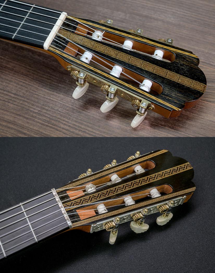 Los clavijeros (página izquierda) y el reposabrazos son elementos modernos añadidos por Fructuoso a sus guitarras románticas.