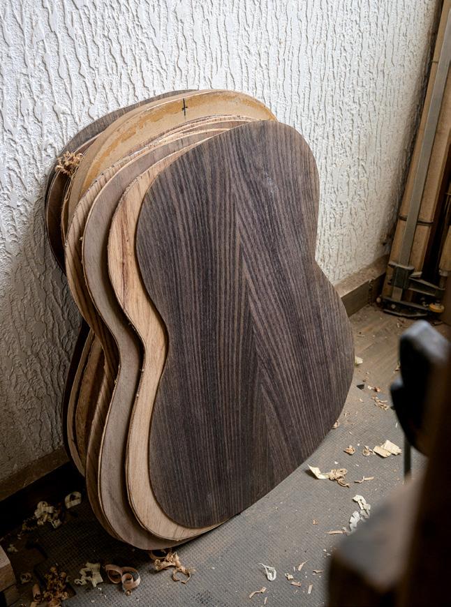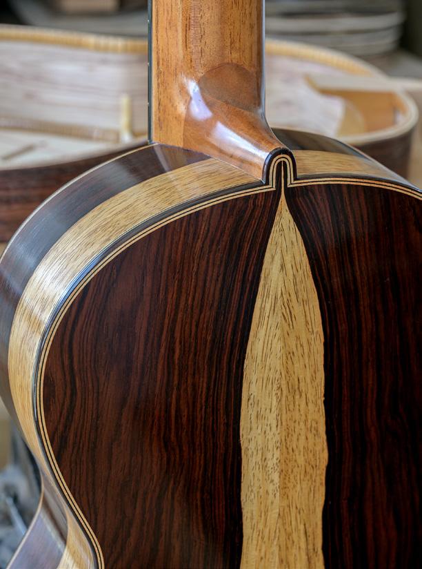fondos chapados, laminados. Esto también ayuda a mejorar el sonido. Por ejemplo, si pon go palosanto de la India por fuera y ciprés por dentro, el timbre cambia, el sonido es más defi nido, más equilibrado, los agudos son más bri llantes y los bajos cantan más. Es mejor que si hubiera usado sólo palosanto y la conservación de la guitarra es aún mejor. Hago el chapado en el fondo, en los aros, o en los dos, según lo que quiere el cliente. Es muy di fícil ofrecer sólo un modelo per sonal. Aquí el que manda es el cliente y uno tiene que adaptar la construcción a lo que nos piden. Por ejemplo, un amigo me pidió que le hiciera una guitarra de via je, con un diapasón de 61 cm y una caja lo más pequeña posible. Yo nunca había hecho eso, pero era un amigo que lo pedía, y a