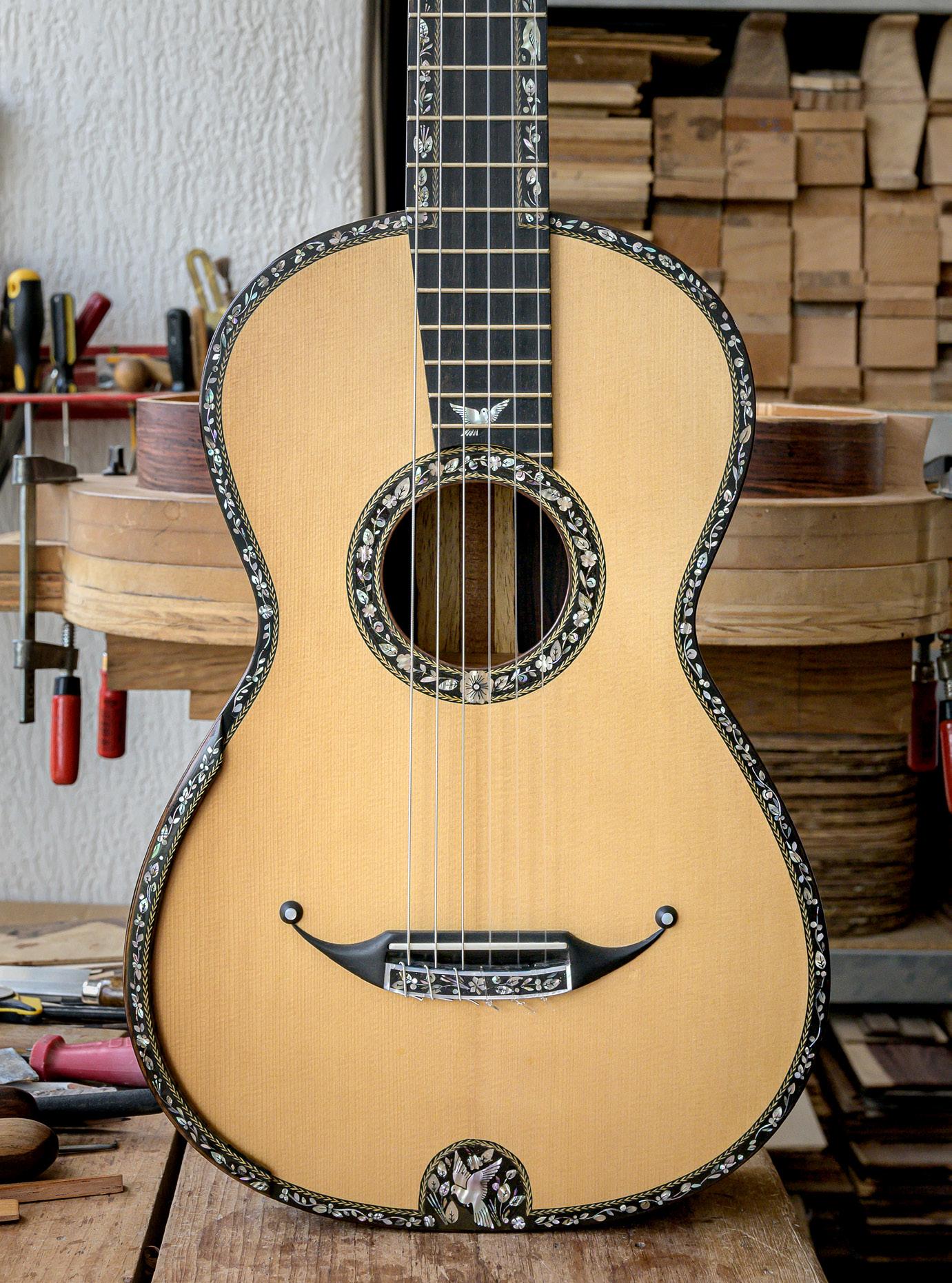 Incluso para facilitar el uso, a la última que hice le agregué un reposabrazo y un puente con doce agujeros. Son como interpretaciones modernas de la guitarra romántica.