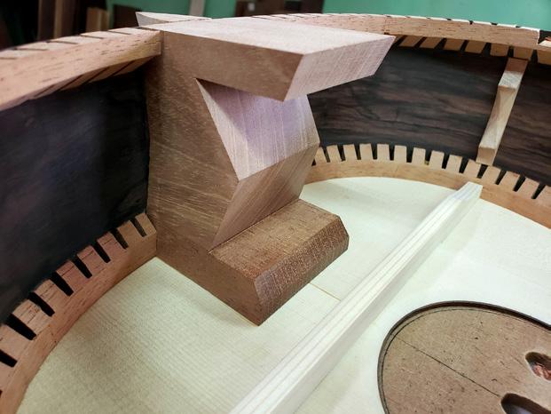 lizada por Torres, y terminé la guitarra en 2015. Fue un trabajo muy difícil que requería mucha precisión, porque si no respetaba exactamente los espesores de los filetes de madera, al final todos los meandros, las espigas y el resto de la decoración resultarían más anchos que el origi nal. Tuve que analizar muchas fotos y hacer mu chos cálculos para determinar el calibre exacto de cada pieza y cada filete.