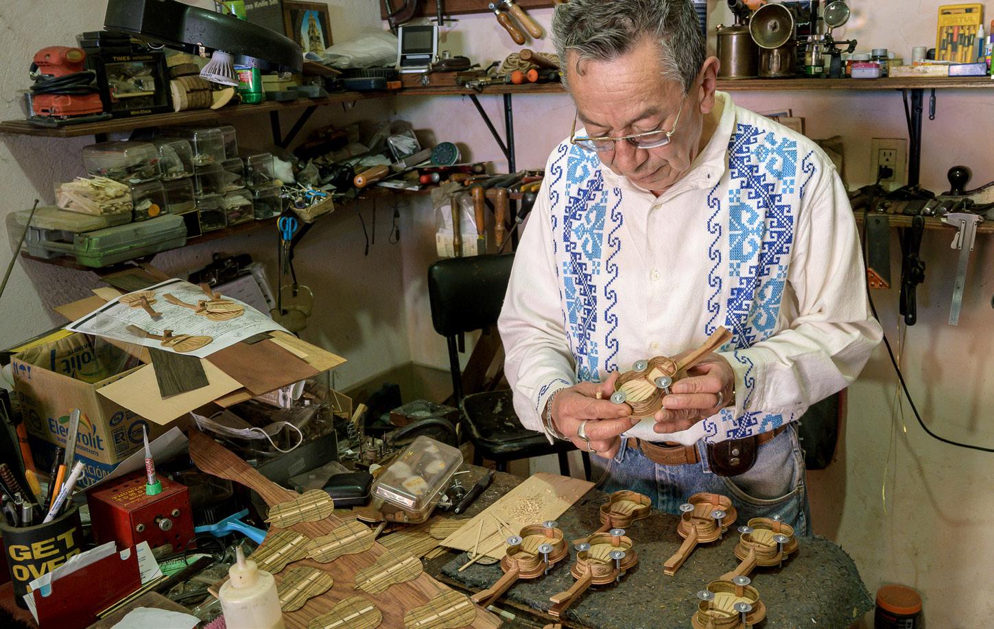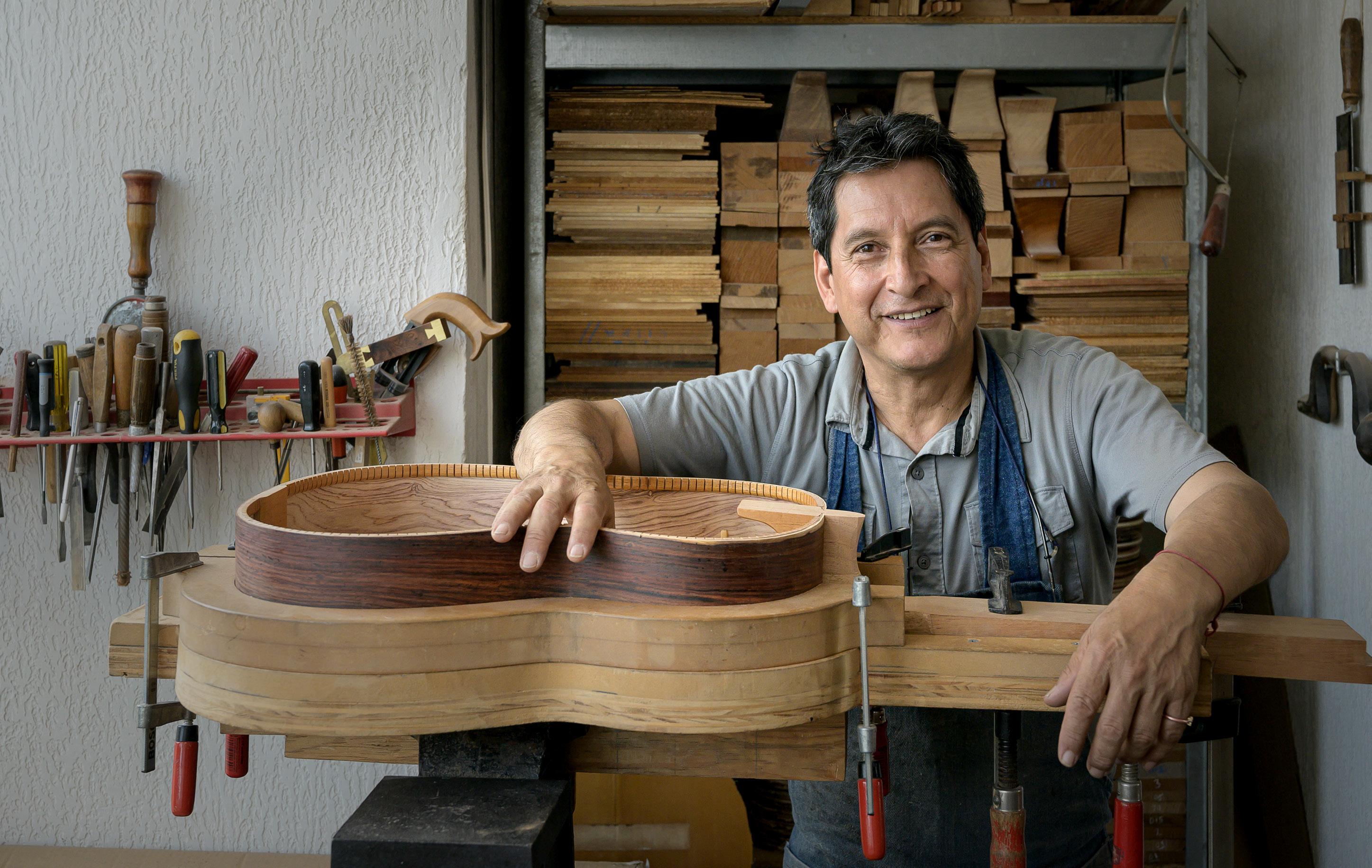 Morelia, la capital del estado de Michoacán, y divide su vida entre su taller mexicano y sus estancias en California. Este año ganó el primer premio en el concurso de construcción de guitarras, categoría Grandes maestros.