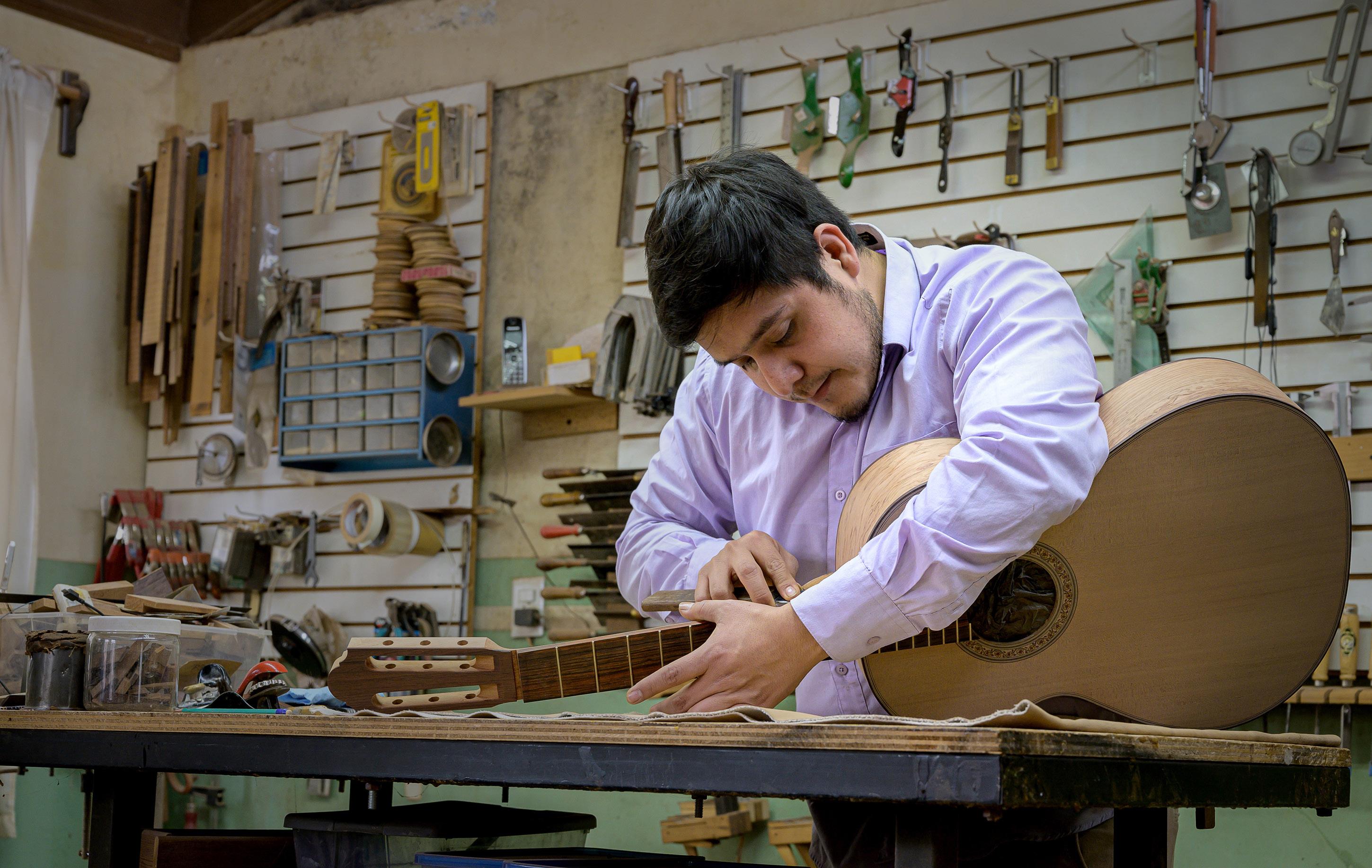 Carlos lleva 14 años enseñando la lutería e incluso ha hecho un manual de construcción de guitarras. Su consejo a los estudiantes: ¡hagan las cosas con amor!