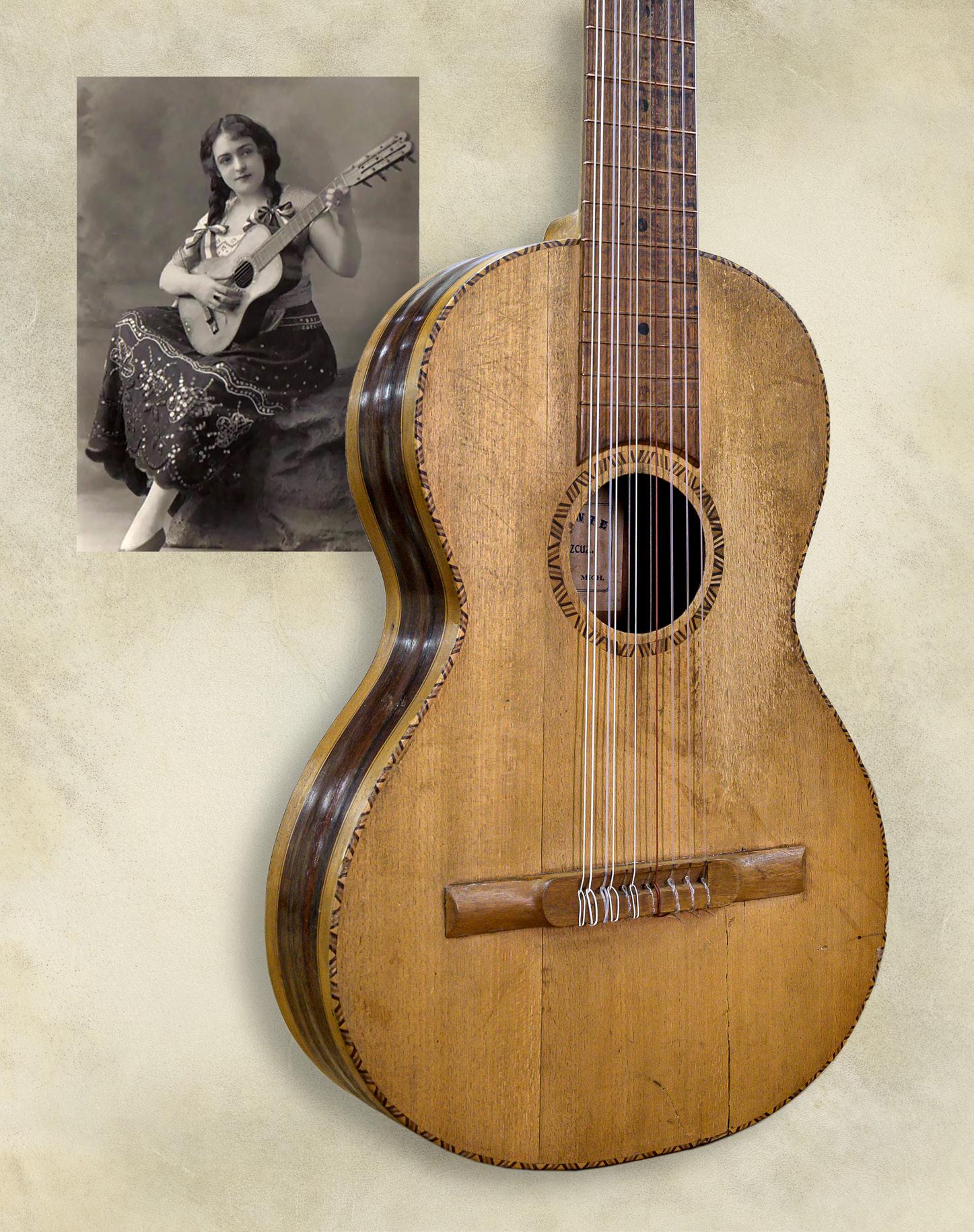 Guitarra séptima de la colección de Jorge Martín Valencia Rosas. Arriba, la actriz Mimi Derba.