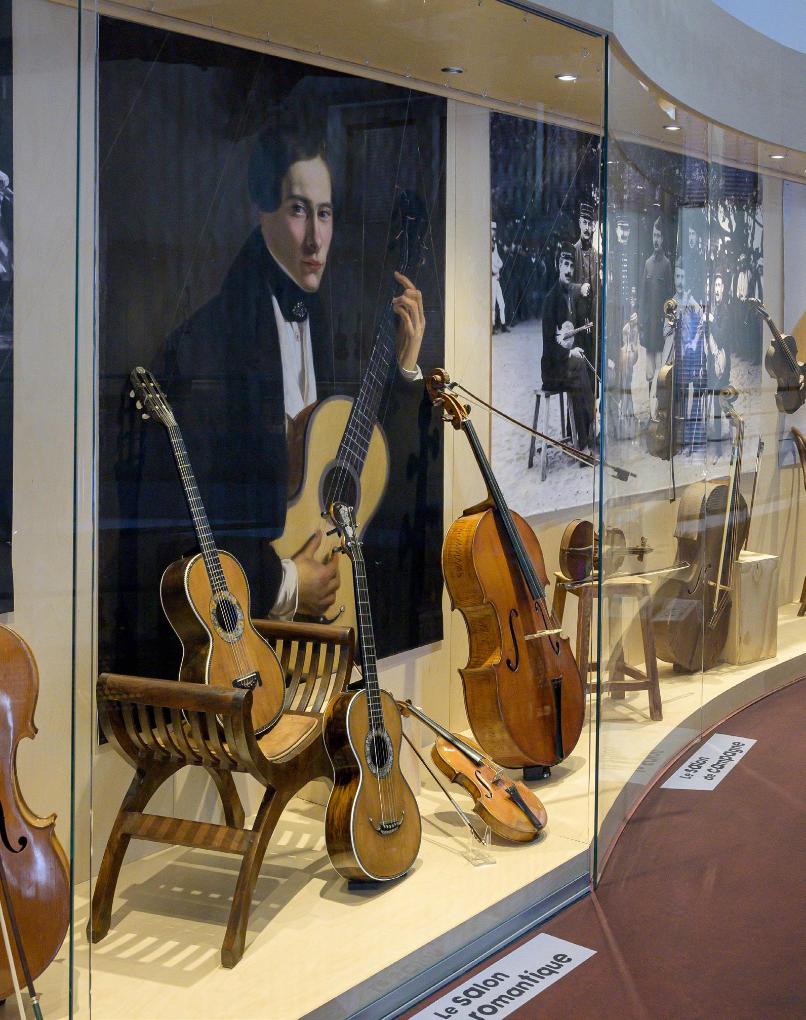 Museum display case featuring Romantic guitars and the painting “Young Man playing the Guitar” by François Navez, 1836.