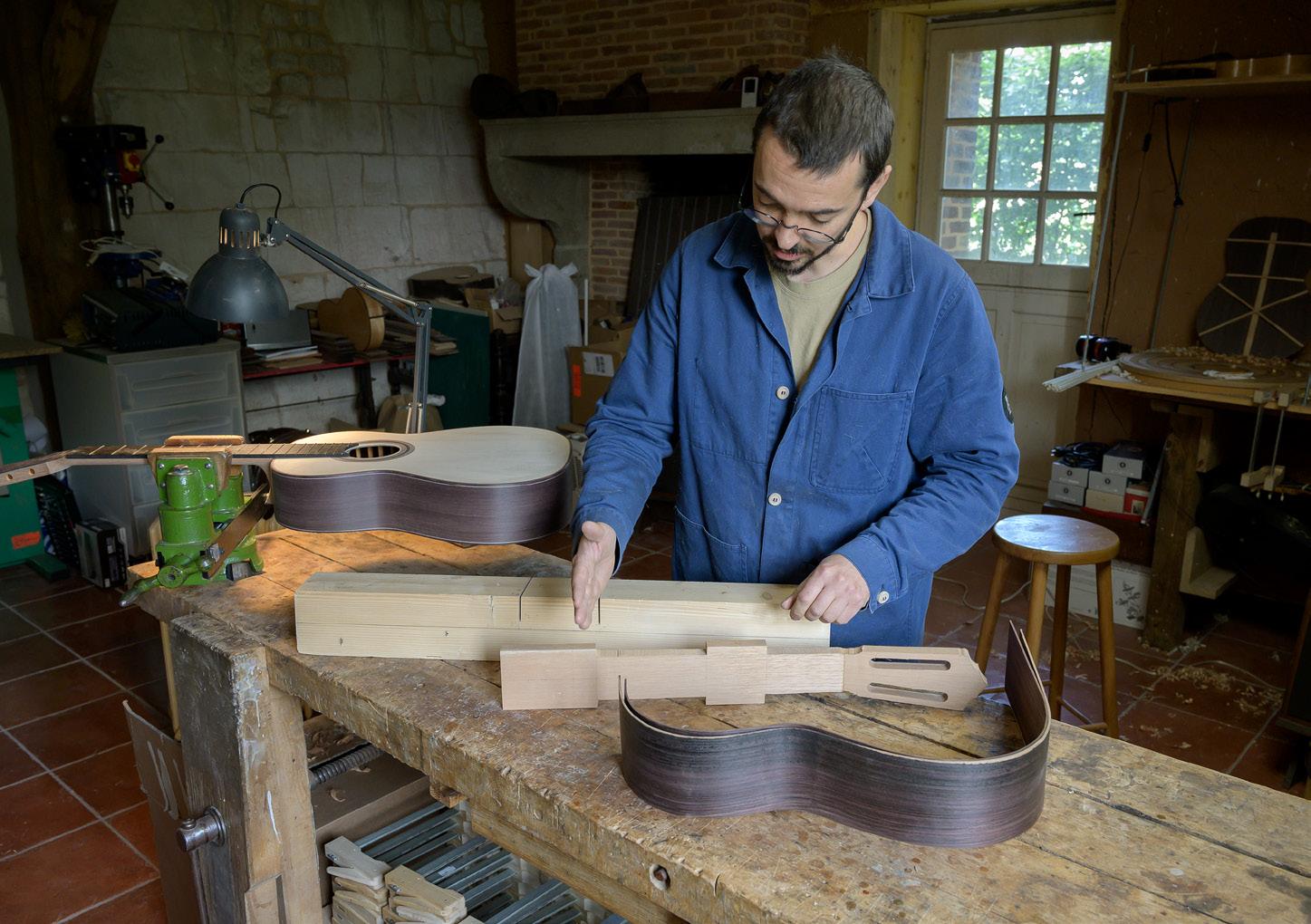 guitars: French lutherie seemed unattainable. Little by little, I began inching my way towards it, starting with Bouchet’s nodal bar, or Friederich’s laminated sides. Very quickly, I understood that merely copying the construction was never going to achieve the sound that I was seeking; it was first important to grasp the luthier’s philosophy and choices. These French bracing styles, for example, were suited to a given type construction and a given type of wood: they were not at all universal; they were very personal. For Bouchet-style construction, selecting wood that was too stiff for the soundboard or for the nodal bar would lead to disaster. For Friederich, it gets even worse: choosing the wrong wood or the wrong thicknesses would mean that the resultant disaster would be further amplified by the laminated sides. In 2007, I established my first workshop in Libourne, my home town, and in 2009 moved to Bordeaux. Around 2012, I began to truly understand this lutherie and my guitars started to develop, both in terms of proportions and construction.