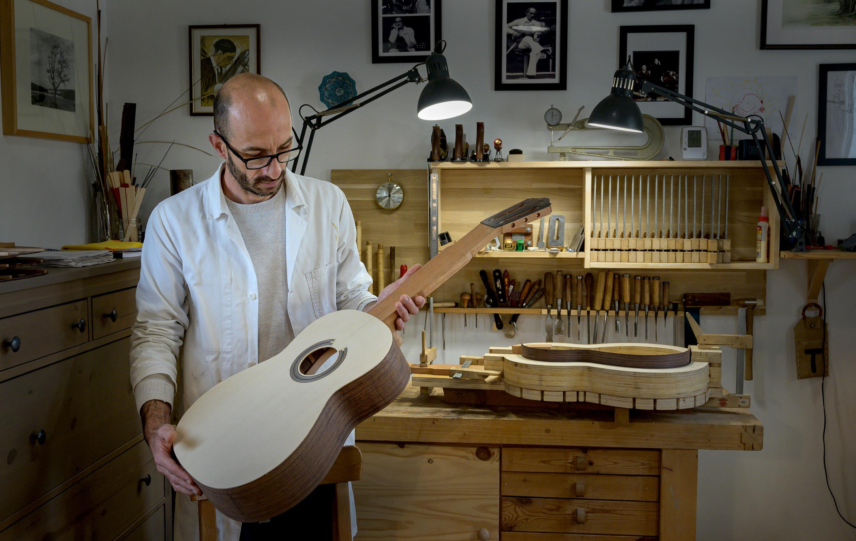 from some luthiers, I built my first guitars in the living room of my flat. There was dust everywhere and my guitars were dreadful! But, as a perfectionist and someone who is always determined to keep going on any project that I start, I kept on making simple guitars which, although they could never become concert models, nonetheless helped me improve my technique. I found the work really fulfilling, in