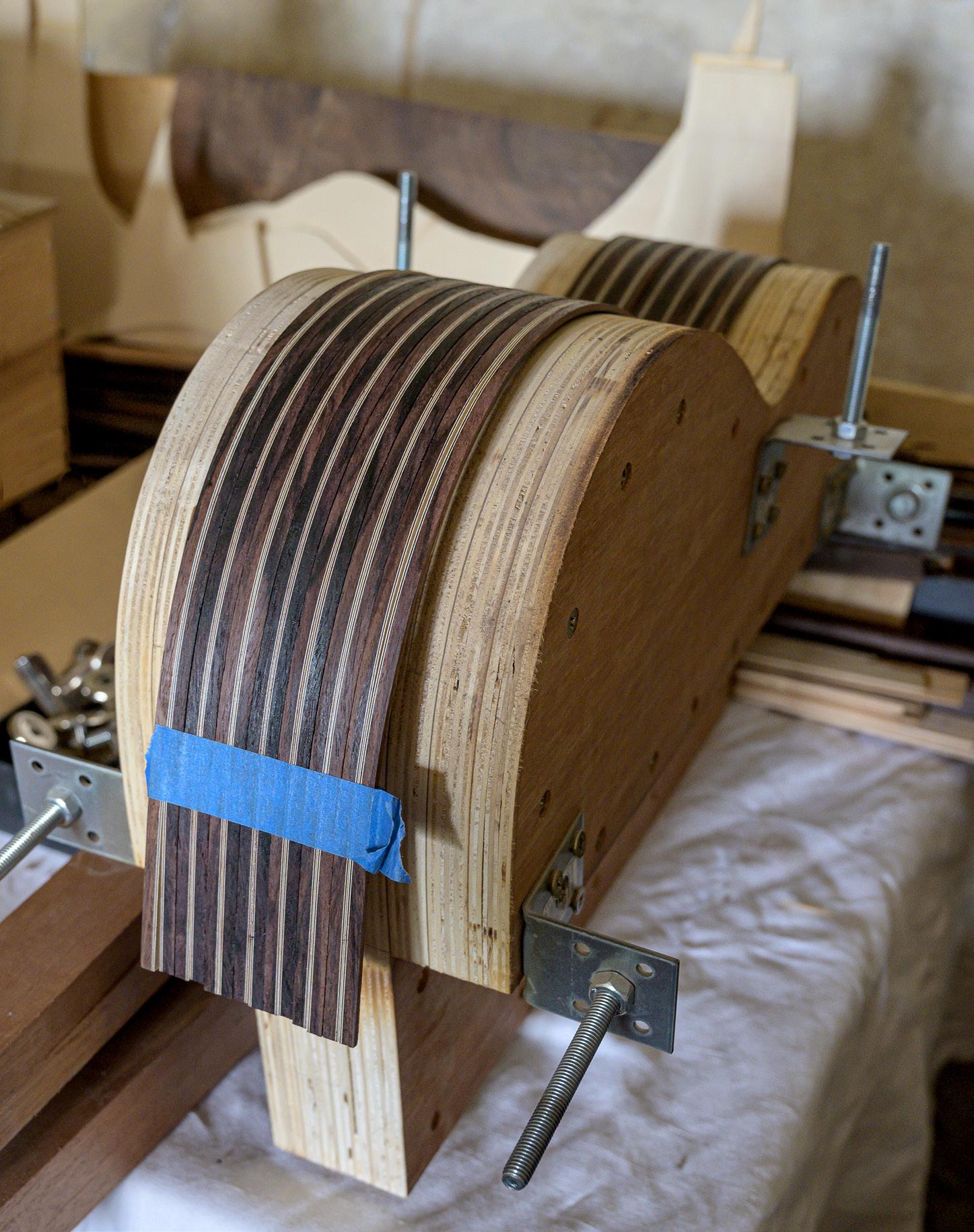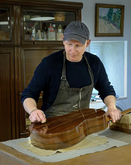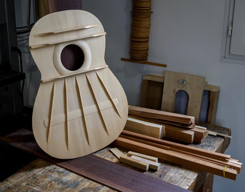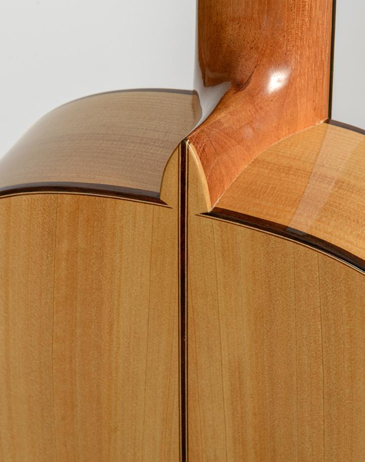 of cedar. Another construction detail is that I slot the ribs directly into the neck, with no need for wedges thanks to a slit carefully measured to the exact size. I created a template for myself so as to avoid any mistakes with the angles. I add a slight twist to the fingerboard, offering a little more room under the bass strings which means that the saddle can sit straight, set at equal height all the way across. I also carve small notches into the saddle in order to modify the point of contact depending on the string. For example, I make a deeper notch into the edge of the saddle under the G string so as to give it a longer scale length. This is an issue in particular with nylon strings, and especially the G string, which has a greater diameter than the others. There are two funny little tricks that I learnt in Italy and which come from violin lutherie. When using animal glue, if you want to slow down the drying process, you can do one of two things: the first is to add a few drops of vinegar to the glue. The drawback is that it alters the glue over time and so it cannot be stored; you have to discard it when you have finished gluing. The second option is to add a clove of garlic to the glue and heat it for an hour or two. Unbelievable though it may seem, this prolongs the drying time without altering the glue. The problem is the smell… fortunately, it goes away once the glue is dry!