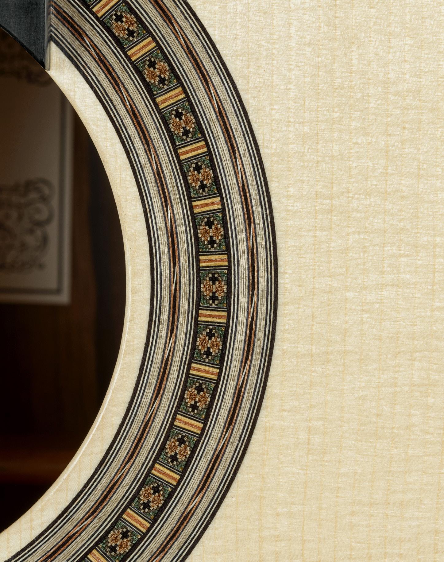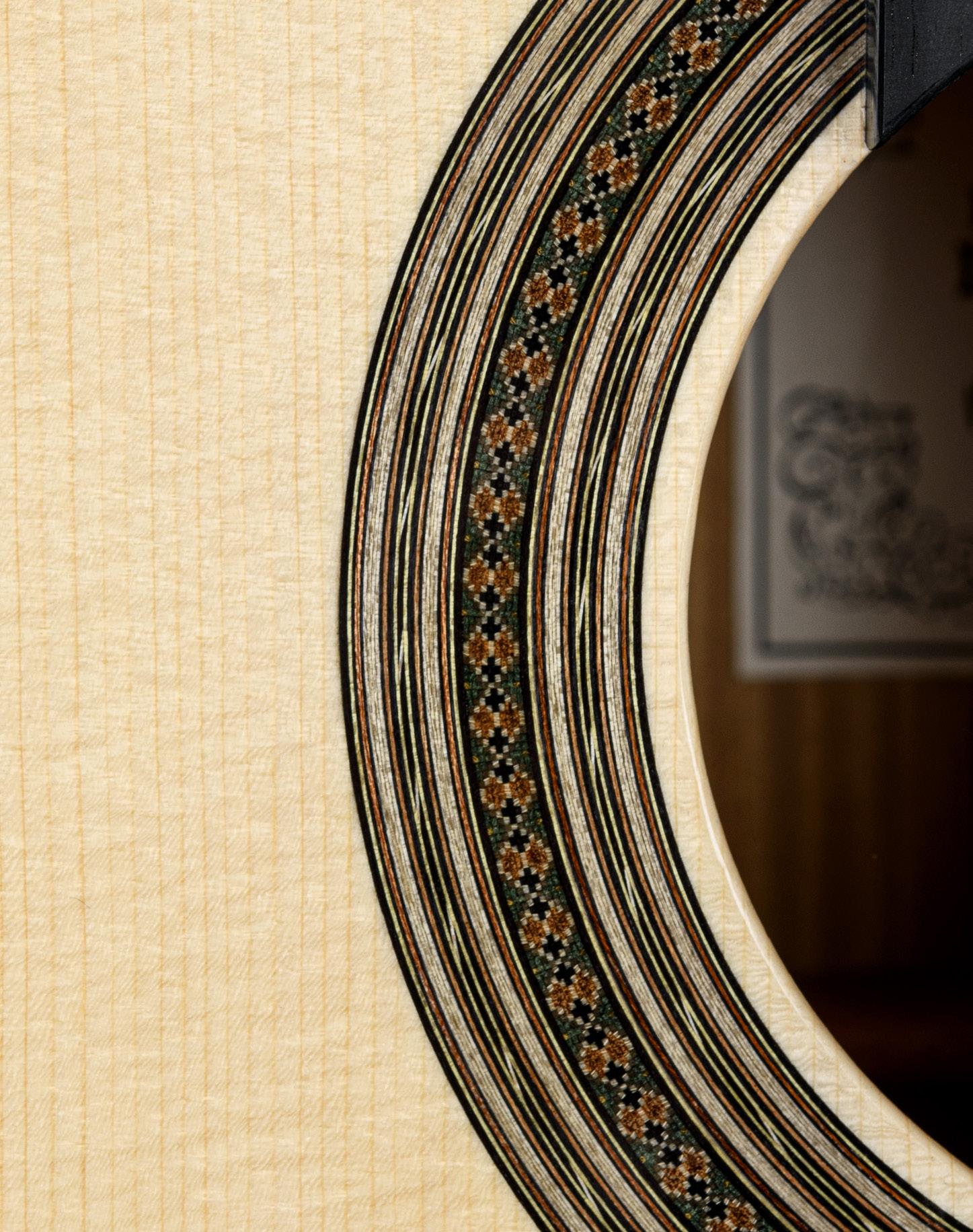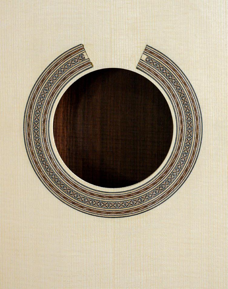 teacher and to some local luthiers, who encouraged me to keep it up. My subsequent meeting with Dominique Field made all the difference. He helped me develop the construction technique and aesthetics of my guitars and rosettes. Dominique pushed me toward fine lutherie. My rosettes follow in the tradition laid down by Robert Bouchet and Dominique Field: understated and yet very sophisticated. I have yet to find my very own rosette, an all-time signature style, like Daniel Friederich’s rosettes. With my temperament, I change design every five or six guitars. I don’t vary them greatly, but I do like blending the same ingredients in different ways, much like musical variations on a theme.